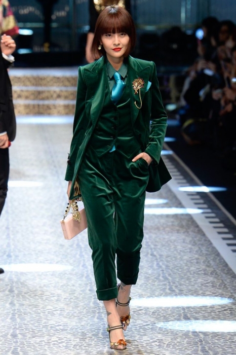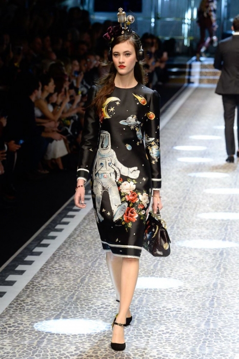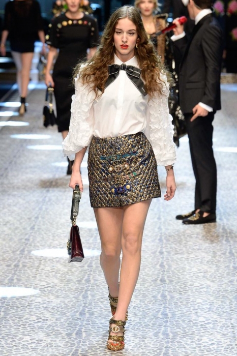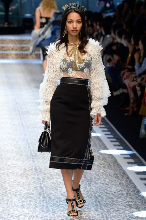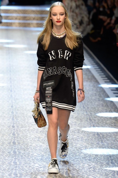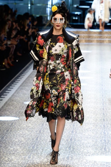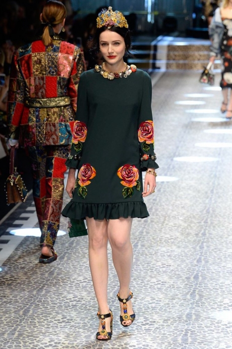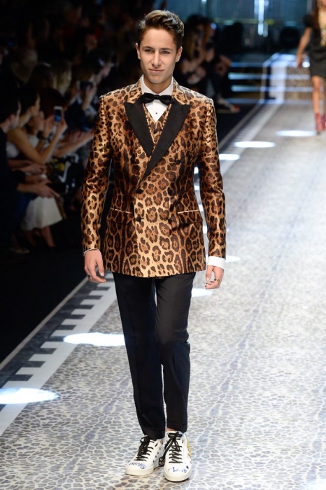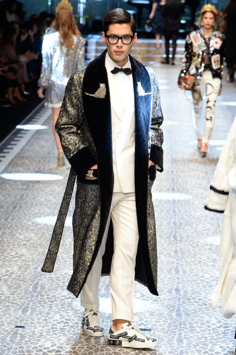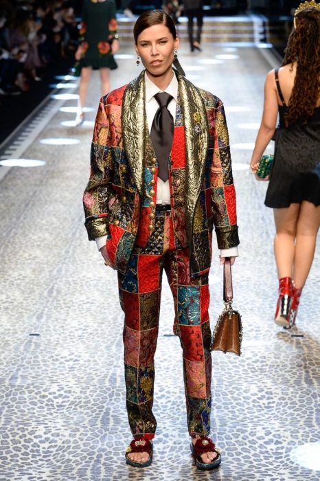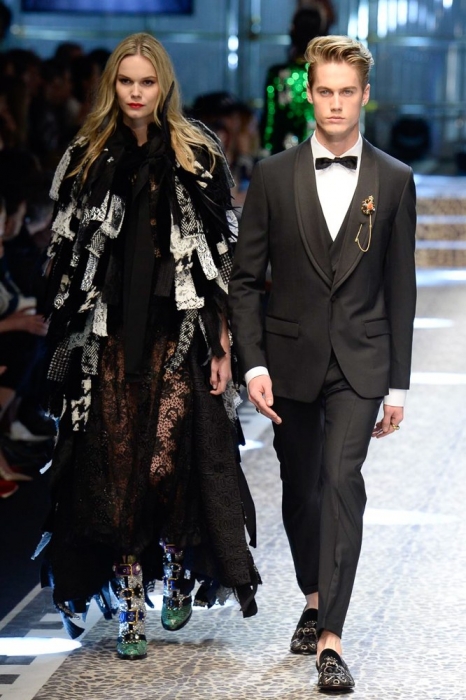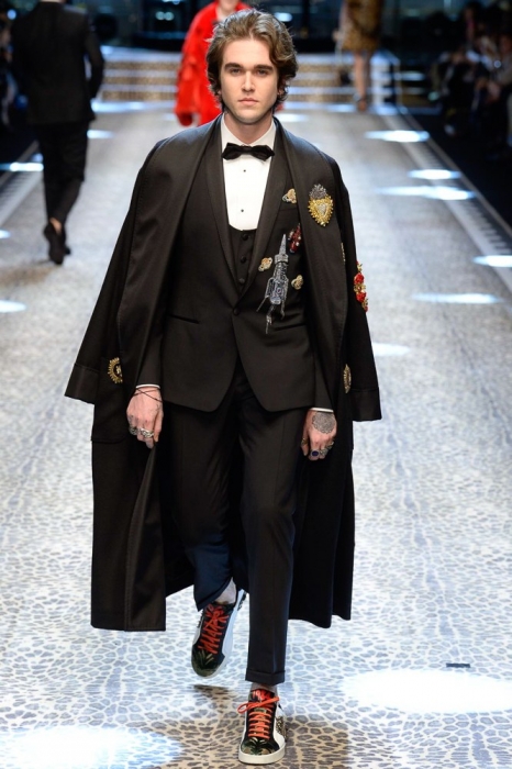 На показе в Милане были показаны почти все коды, которыми эксплуатирует марка начиная с восьмидесятых годов: много леопарда и цветов, сицилийских орнаментов и силуэтов, кружева, золота, меха и переливающихся тканей. И бонусом футболка с Джастином Бибером, который, по задумке дизайнеров, и воплощает культуру миллениалов.