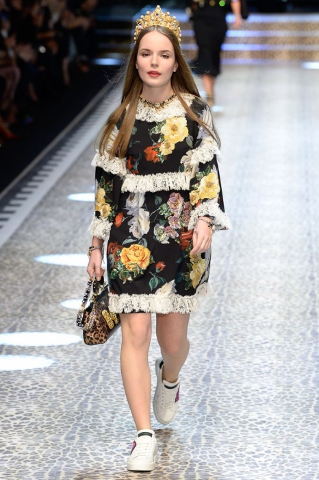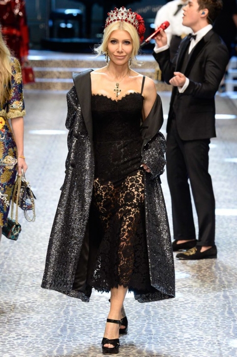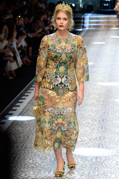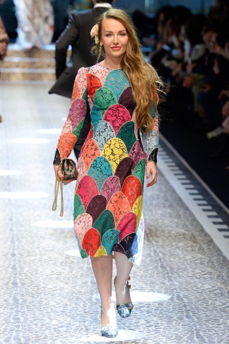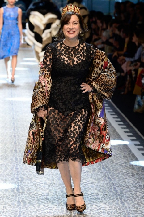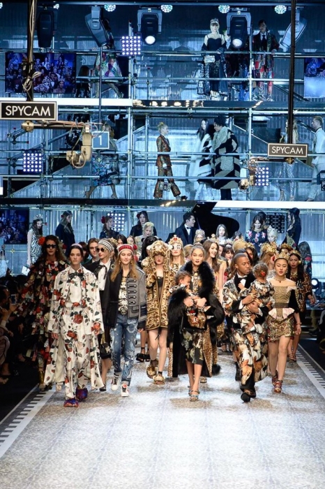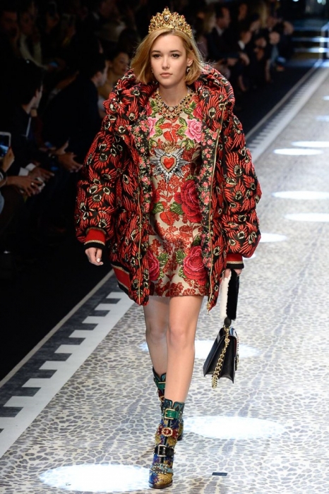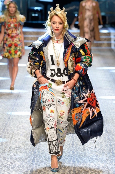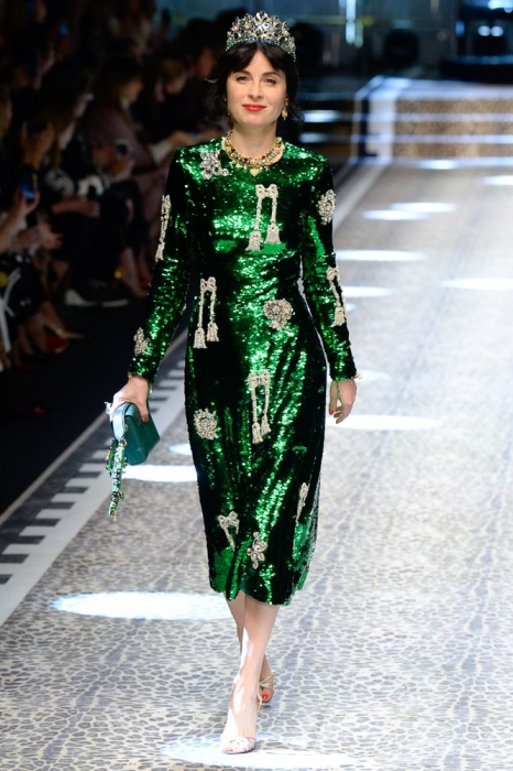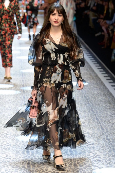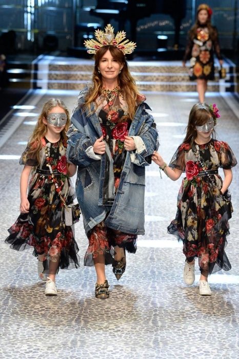 Платье Dolce & Gabbana украшает всех — эту аксиому Доменико Дольче и Стефано Габана и выбрали темой для осенней-зимней коллекции. На подиуме мы увидели супермоделей, клиентов бренда разных возрастов и фигур, блогеров (например, Кристину Базан), целые семейства, певиц (например, Мэдисон БирМодел или Хлои и Вайли Бейли, которых называют протеже Бейонсе) и российских it-girls (Стеллу Аминову с дочерьми, Юлию Визгалину, Илону Столье, Елену Лихач, Надежду Оболенцеву и Викторию Шелягову).
