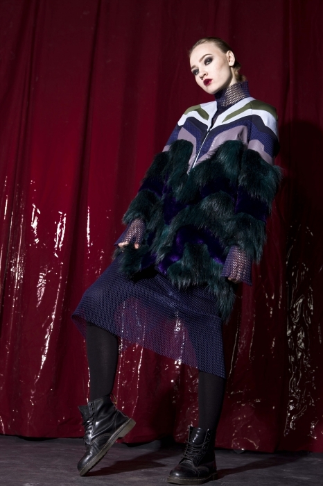 У студентки университета технологий и дизайна есть суперспособность: Ольга лихо миксует материалы и фактуры, которые даже сложно представить рядом. Цветной мех у нее, например, соседствует с фатином, проволокой и лозунгами на спине пальто по законам 2017-го.