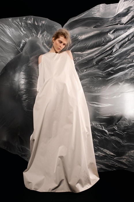 Дизайнеру из Красноярска удается уместить в одном луке прозрачные ткани, вязку и плащевку и при этом не выйти из рамок белого цвета.