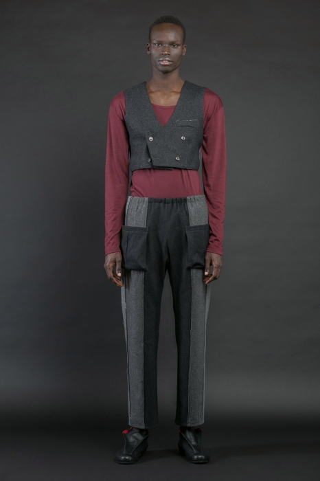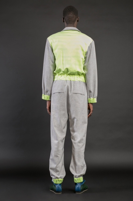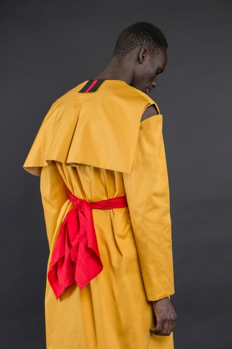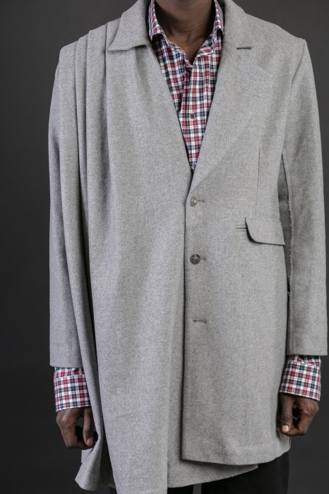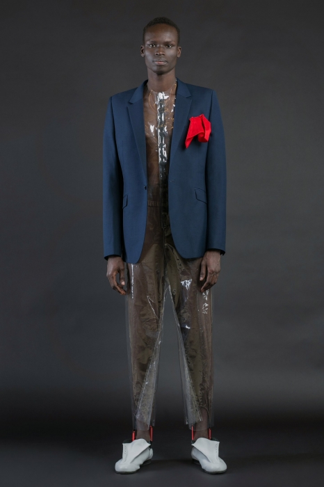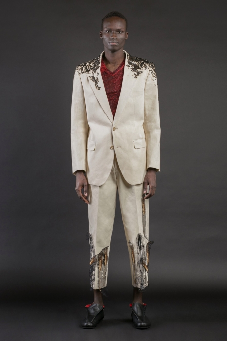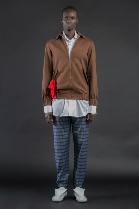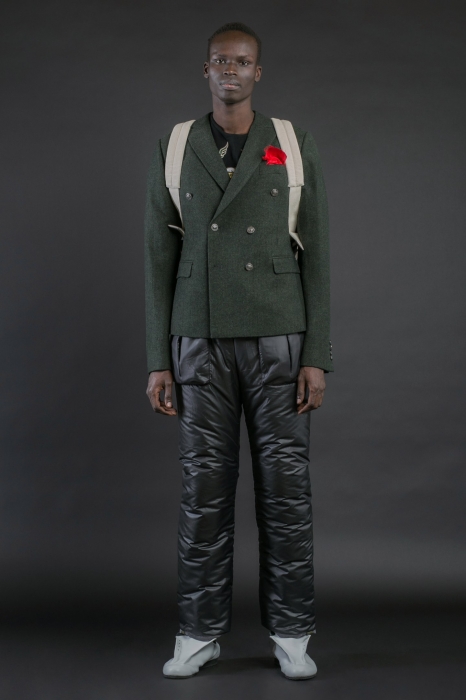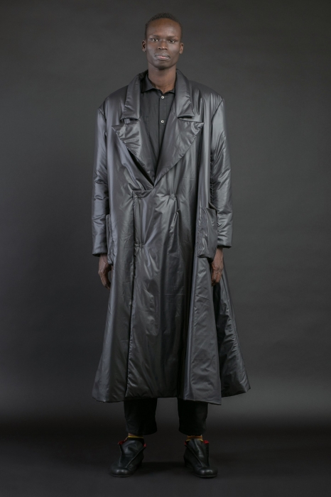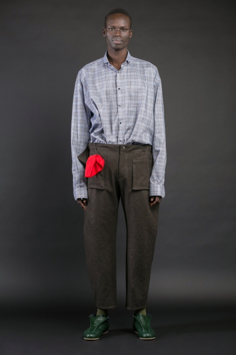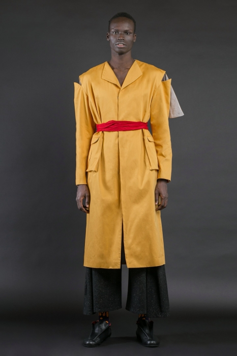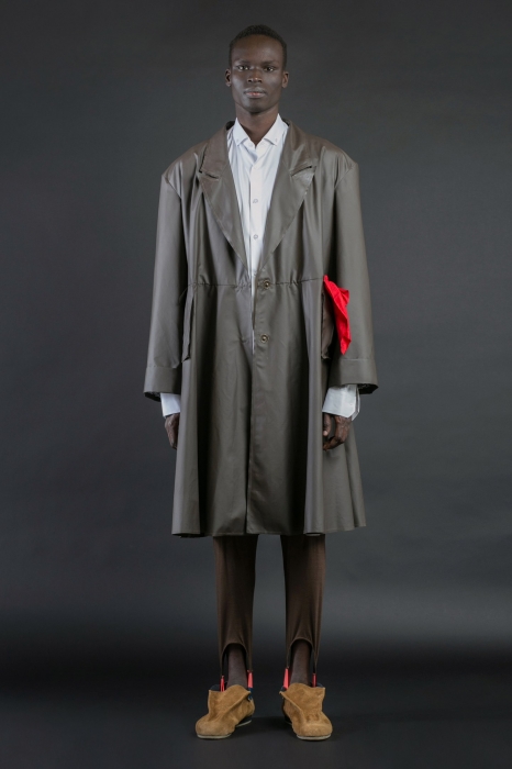 За вдохновением дизайнер обратился к истории России — и получилась коллекция с военными мотивами. Речь идет о верхней одежде, преимущественно шинелях, легких куртах с опущенными плечами, плащах с красными пятнами. «Я хотел запечатлеть очень короткий момент в нашей истории – время между царской Россией и СССР, одно мгновение, в котором общество было расколото. Мне очень интересны люди того времени, военные, банкиры, продавцы, садовники, почтальоны, как они жили своей простой жизнью в непростое время», — прокомментировал свой мудборд Артем.