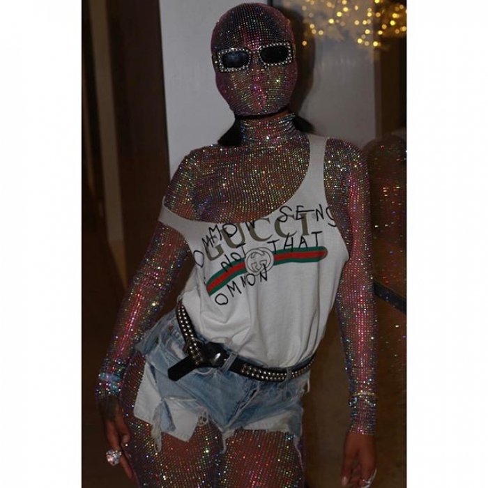 «I can't go home yet, cuz enough people ain't seen my outfit» — с таким комментарием Рианна поделилась своим образом в инстаграме. В прозрачном, но расшитом тысячами страз комбинезоне и маске (всё — Gucci): за тотальным блеском осталась незаметной майка с цитатой из Вольтера («Common Sense is not so common»).