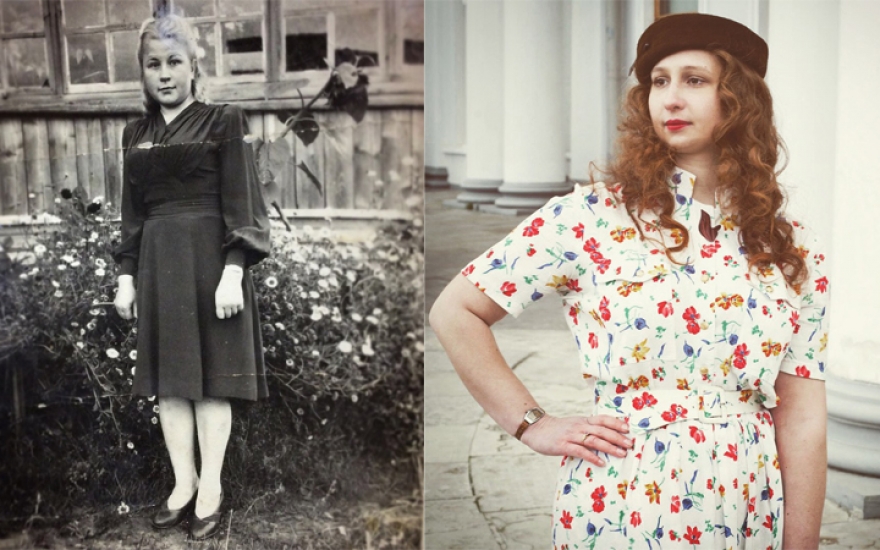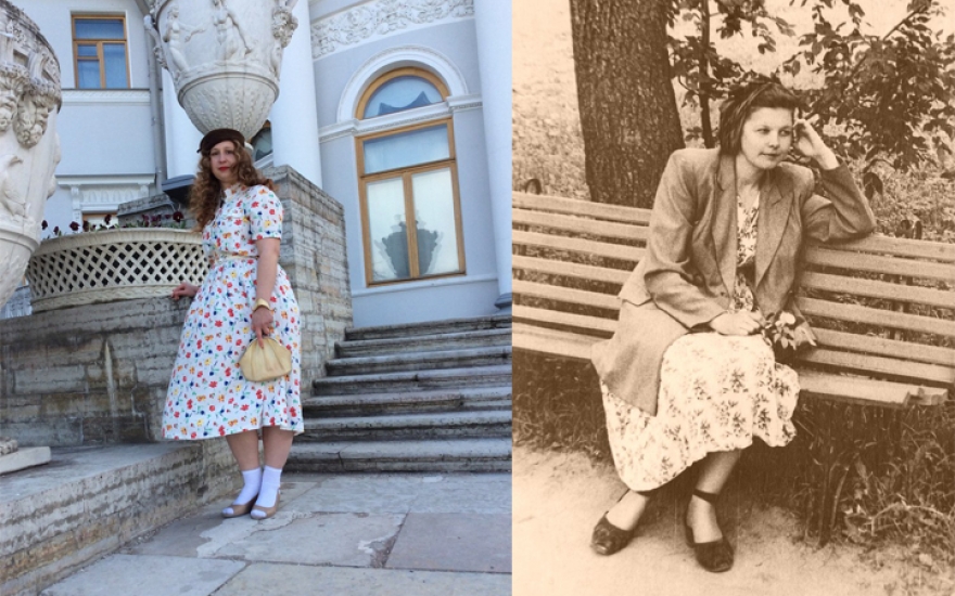 Модель на «Показе мод 1945 года» одета в платье моей мамы. Фотография справа — моя мама, дочь капитана I ранга, сражавшегося на море с первого дня войны, прошедшая голодную эвакуацию в Поволжье. Снимок сделан в Летнем саду, в 1945 году, маме исполнилось 15 лет