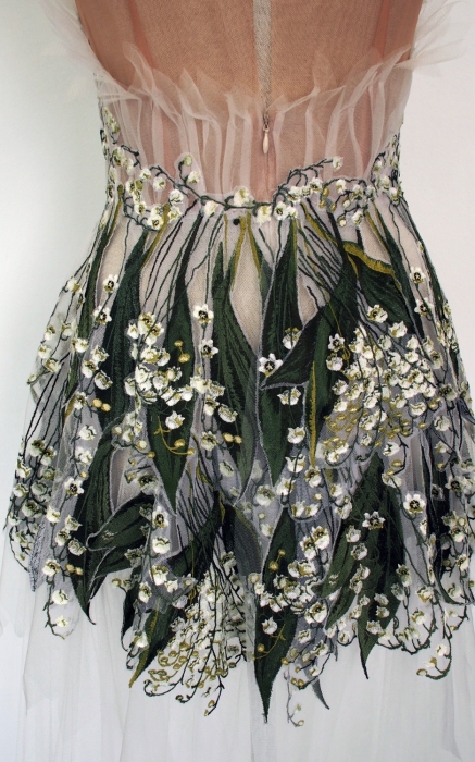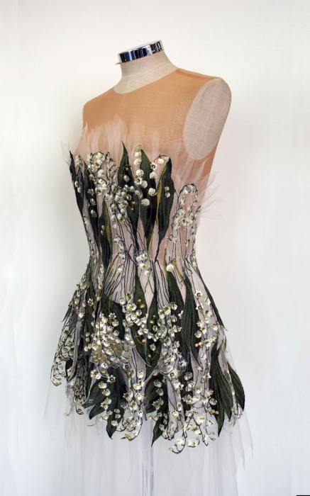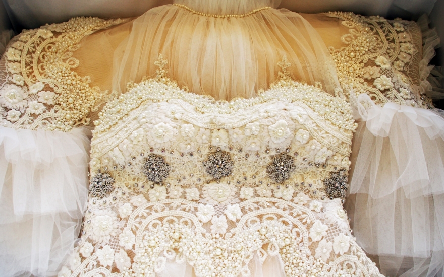 Для прима-балерины Мариинского театра и своей главной музы Татьяна Валентиновна сшила нежное, совсем прозрачное свадебное платье с имитацией ландышевого букета в талии и груди. Цветы повторял необычный головной убор Дианы Вишневой, похожий на балетные «ушки» — только вместо перьев и страз его украшали крупные жемчужины, гипюр и трава из ткани. Перламутровый морской камень также был и на браслетах балерины, надетых на обе руки, — из всего ансамбля «выбивались» только босоножки с открытым мысом и стразами. Хотя их Диана скинула, как только вступила на песочный пляж, — ее свадьба с продюсером Константином Селиневичем прошла на Гавайских островах.