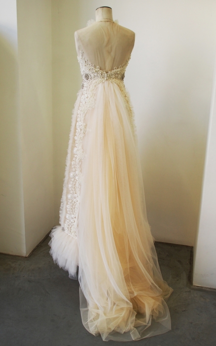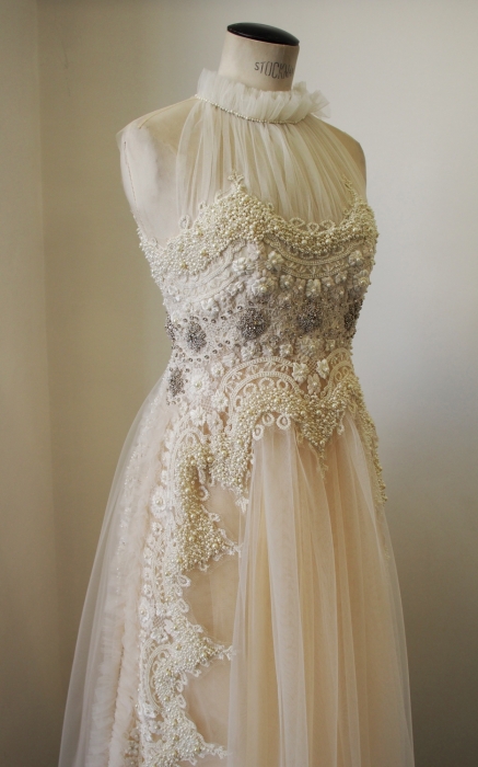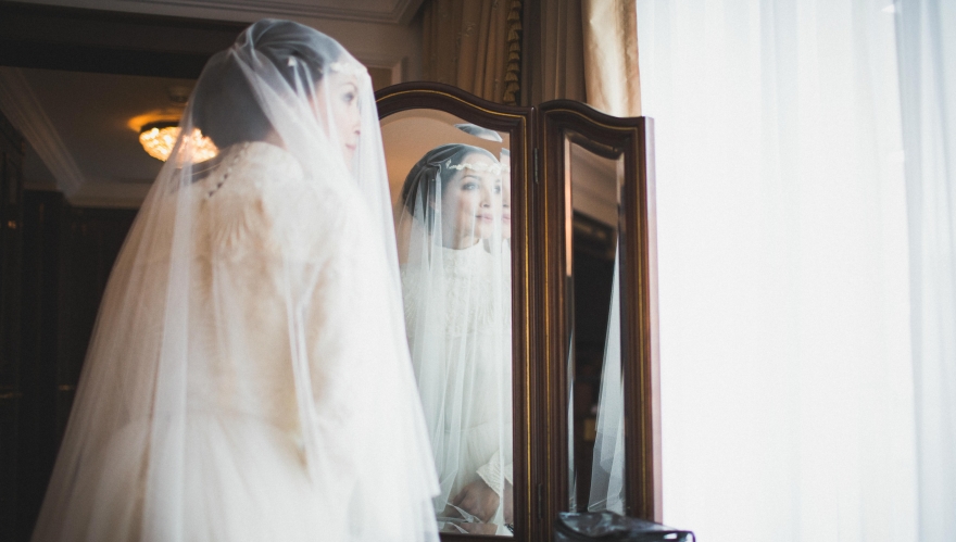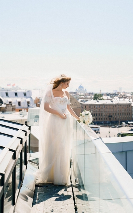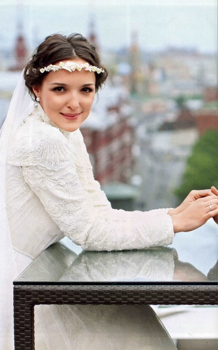 На время подготовки к свадьбе дизайнер стала Алине второй мамой: она не только рисовала эскизы, подбирала ткани и искала нужные украшения, но и утешала невесту в момент нахлынувших чувств и советовала прикрепить к подолу голубой бантик — «от сглаза». «Я очень далека от светской моды и понтов, от страз, блесток и пышных юбок, у меня было венчание, поэтому хотелось скромный и изящный наряд, который я могла бы передать потом дочкам. В результат я влюбилась сразу на первой примерке. А когда платье было готово, оно пришло мне домой в большой шелковой коробке. После свадьбы я сложила туда духи, которые были на мне в день церемонии, и другие вещи-воспоминания».