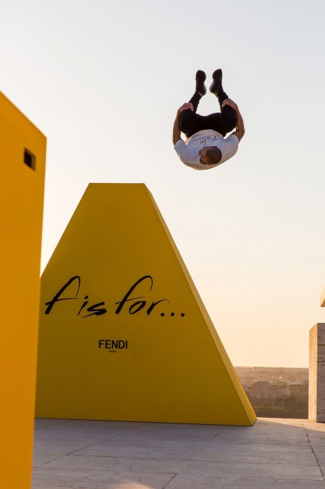 Каскадер и паркурщик из Петербурга Эрик Мухаметшин, вошедший в Книгу рекордов Гиннесса за самый высокий флип у стены, снялся в промо весенне-летней коллекции Fendi Leisurewear. Вместе со своей девушкой — британской моделью и фриранершей Кэти Макдоннел они выполнили серию трюков на крыше Дворца Итальянской цивилизации. Ранее ее расписал каллиграф из Петербурга Покрас Лампас.