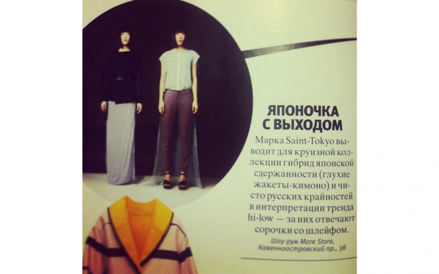 На момент, когда я отшил коллекцию на заработанные деньги в бутике Day’n’Night (чередовал пары в университете и смены), это было отличным стартом. «Собака.ru» узнала обо мне, когда я сам о себе ничего не знал. Поддержка была колоссальная. Помню, в маленьком магазине на Петроградке, куда я отдал свои первые вещи, каким-то образом оказалась Яна Милорадовская. Она прошлась, просмотрела рейлы, отобрала из всех коллекций два лука Saint-Tokyo и попросила прислать ей фото. Эти модели появились в следующем номере «Собака.ru» под заголовком «Японочка с выходом». Моя первая публикация в журнале, 2014 год!