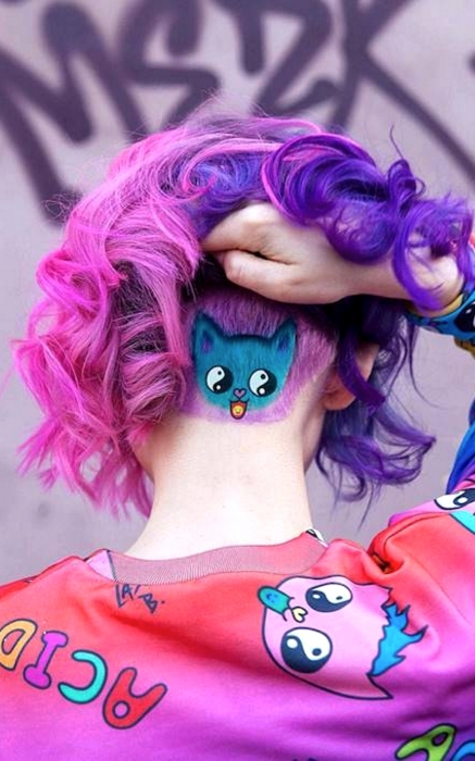 Выстригать и окрашивать треугольники на затылке давно не новость, этим в последние пару лет занимаются все продвинутые мастера. Прическа с секретом похожа на татуировку на крестце: никто не видит, а она там. Но Алия пошла дальше и решила создать авторские трафареты рисунков. Теперь под волосами можно носить рыжую лису, серого котика, голубую медузу, пчелиные соты или пришельца любого окраса. Няшная тема, которая довела парикмахера до «фишек», нет, не стала ее единственным успехом — запись к стилисту трещит от желающих сменить цвет волос на единорожий. Немалую часть базы составили сорок тысяч подписчиков @aliyousha в инстаграме.
