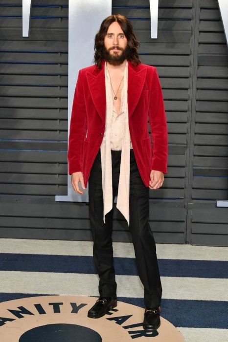 За мужской стиль на вечере отвечали спутники актрис и мастодонт стайлинга Джаред Лето. Лауреат «Оскара-2014» за драматичную роль в «Далласском клубе покупателей» позировал перед репортерами в Gucci — в бархатном пиджаке, рубашке свободного кроя, классических черных брюках и ботинках с фирменной перемычкой. Рядом с ним не хватало еще одного поклонника марки (для которого Алессандро Микеле теперь делает концертные костюмы) Элтона Джона. Певец появился за кулисами церемонии (в «черепашьих» розовых очках!), а в светскую хронику Vanity Fair так и не попал