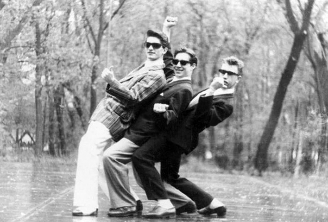 Если после войны в Ленинграде были «стилевики», то стиляги в современном понимании появились в период хрущевской оттепели. В 1956 году хозяин страны отправился в Америку, а позже публично заявил, что узкие брюки практичнее широких, так как на их пошив уходит меньше материала. Ярко одеваться и слушать джаз в это время стало практически безопасно. Послабления коснулись и манеры танцевать, хотя в 60-е в некоторых регионах сохранялись прежние устои. Когда мы с папой путешествовали по Волге, я услышала рок-н-ролл от явно самодельного ансамбля. По микрофону на танцплощадке раздавались слова: «Пожалуйста, уходите! Просим вас покинуть площадку за искривление рисунка танца».