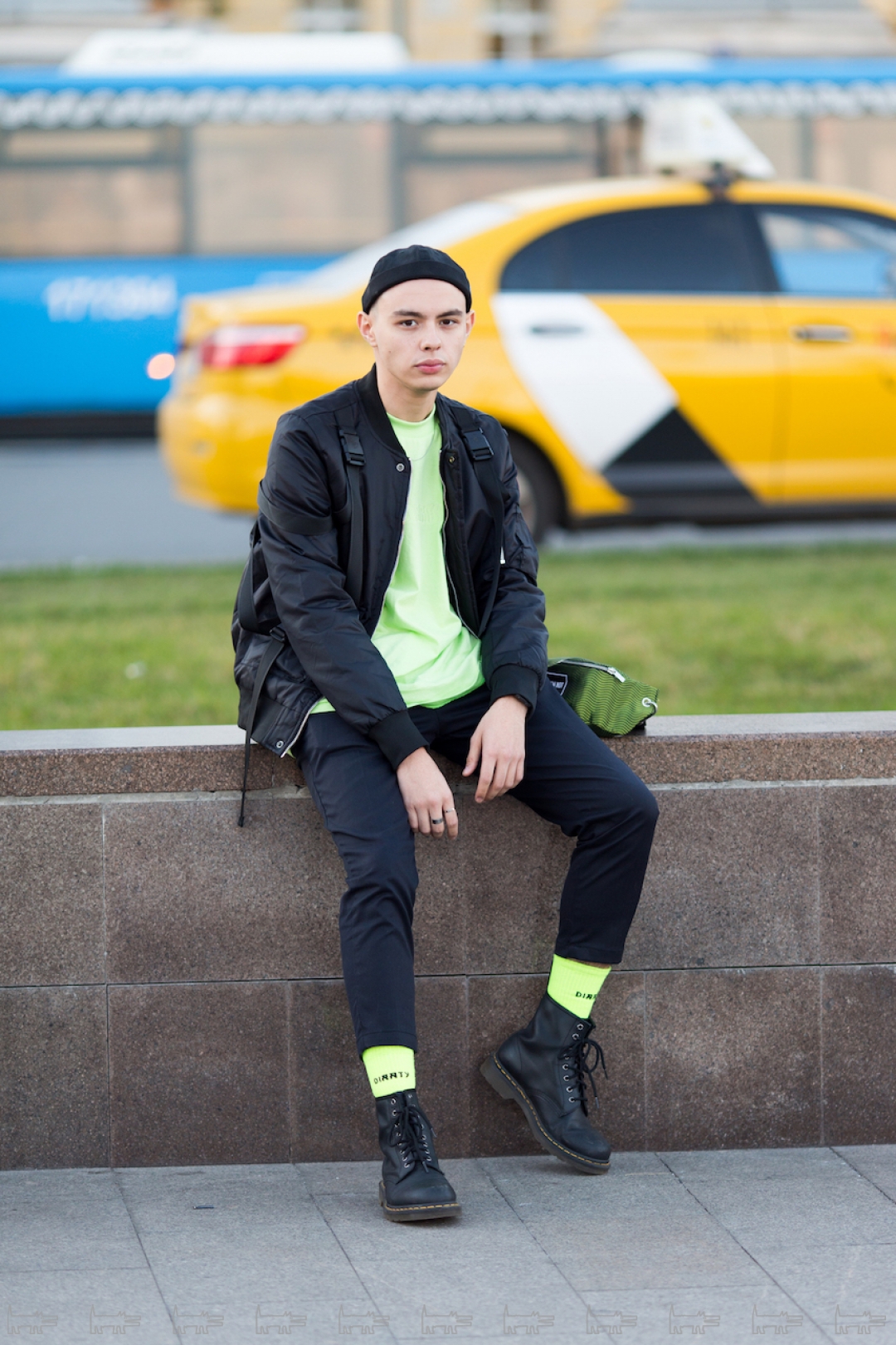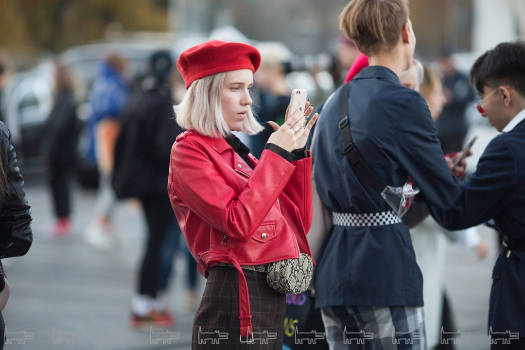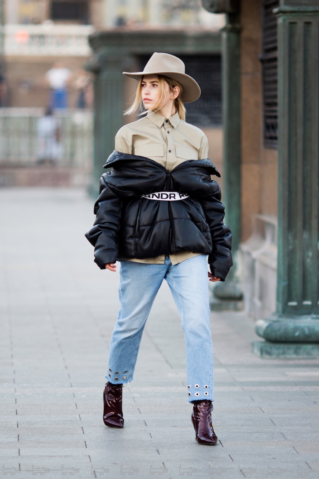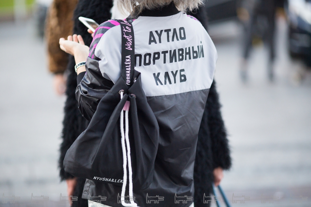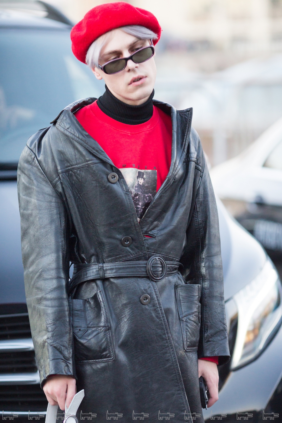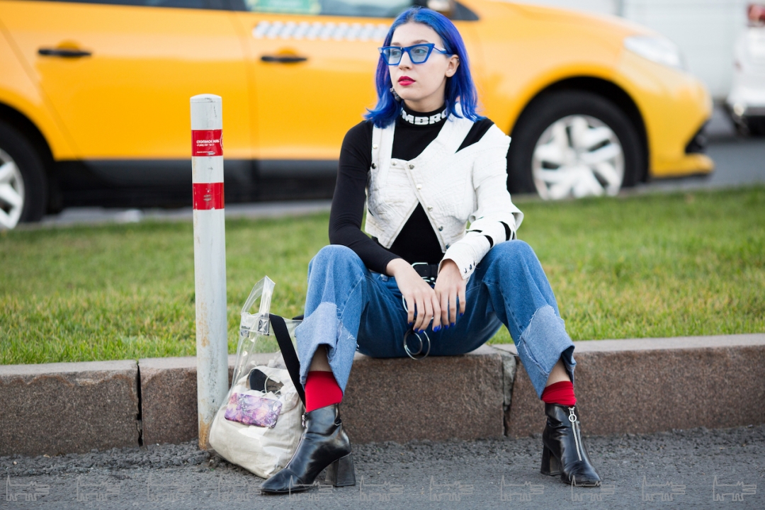 В этом одно из самых больших отличий нашего стритстайла: герои не выгуливают тяжелый люкс (Alexander McQueen, Balmain, Oscar de la Renta и далее по списку), а показывают, как можно одеться красиво и одновременно дешево. Футболка Off-White, как один из самых демократичных способов приблизиться к «магии бреда», здесь замешана с полосатым лонгсливом и крупной цепью, наверняка взятой в отцовском шкафу. Дутая куртка, крепко-накрепко перетянутая ремнем, дополнена джинсами с люверсами, консервативной рубашкой, лакированными ботильонами и широкополой ковбойской шляпой (дань тенденции на вестерн-моду!). А старый кожаный пиджак не по размеру, надет на гобеленовую рубашку и стилизован авоськой с красными яблоками — гости Mercedes-Benz Fashion Week показывают экосознательность в действии.