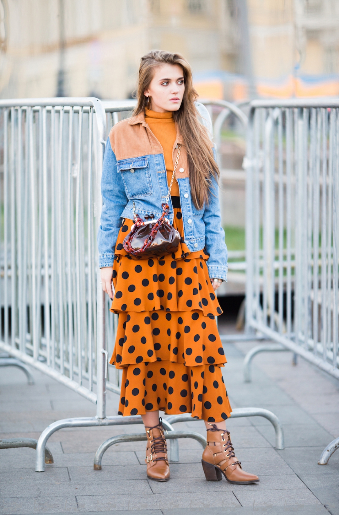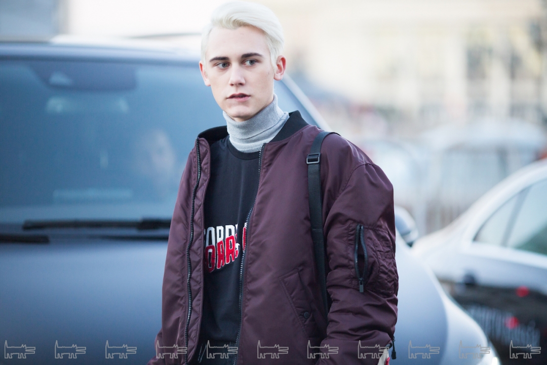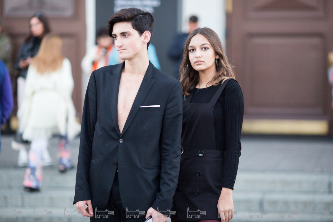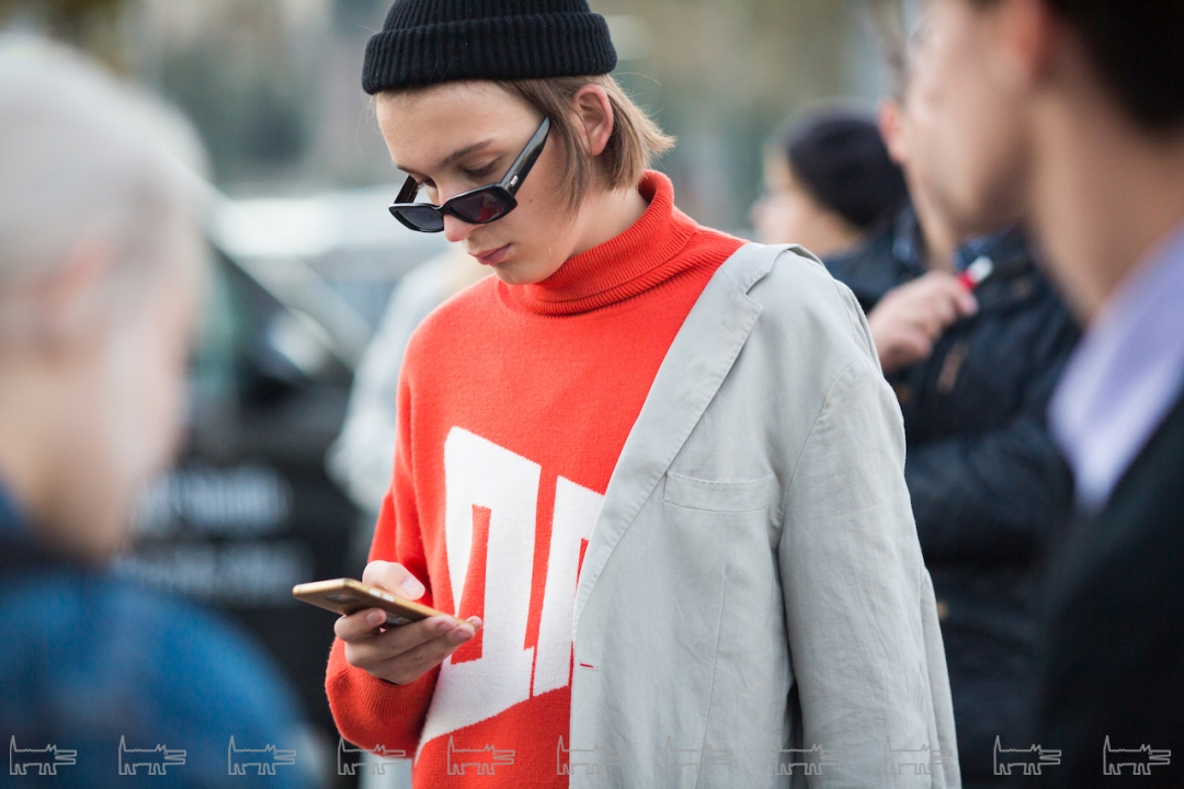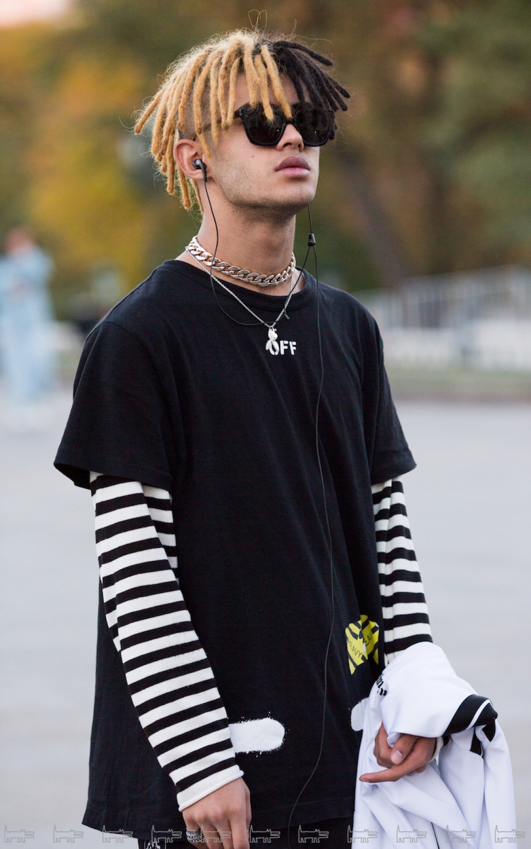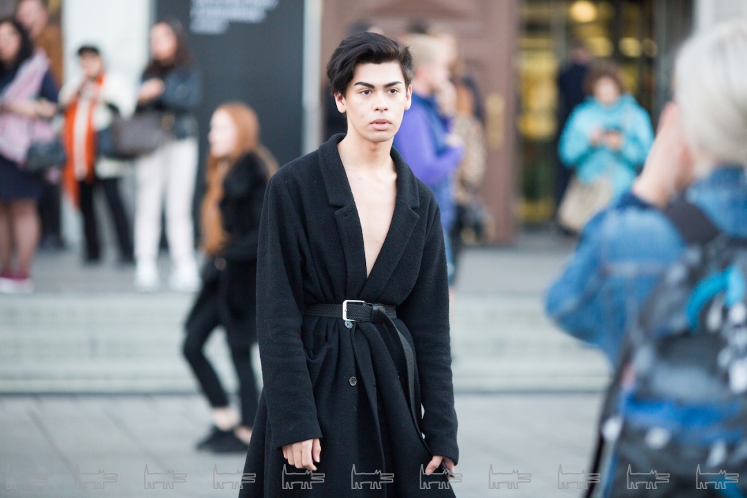 В этом одно из самых больших отличий нашего стритстайла: герои не выгуливают тяжелый люкс (Alexander McQueen, Balmain, Oscar de la Renta и далее по списку), а показывают, как можно одеться красиво и одновременно дешево. Футболка Off-White, как один из самых демократичных способов приблизиться к «магии бреда», здесь замешана с полосатым лонгсливом и крупной цепью, наверняка взятой в отцовском шкафу. Дутая куртка, крепко-накрепко перетянутая ремнем, дополнена джинсами с люверсами, консервативной рубашкой, лакированными ботильонами и широкополой ковбойской шляпой (дань тенденции на вестерн-моду!). А старый кожаный пиджак не по размеру, надет на гобеленовую рубашку и стилизован авоськой с красными яблоками — гости Mercedes-Benz Fashion Week показывают экосознательность в действии.