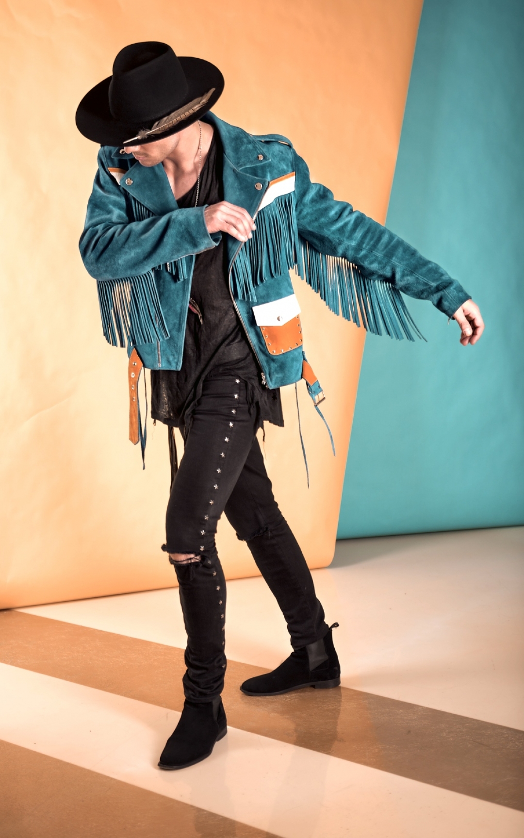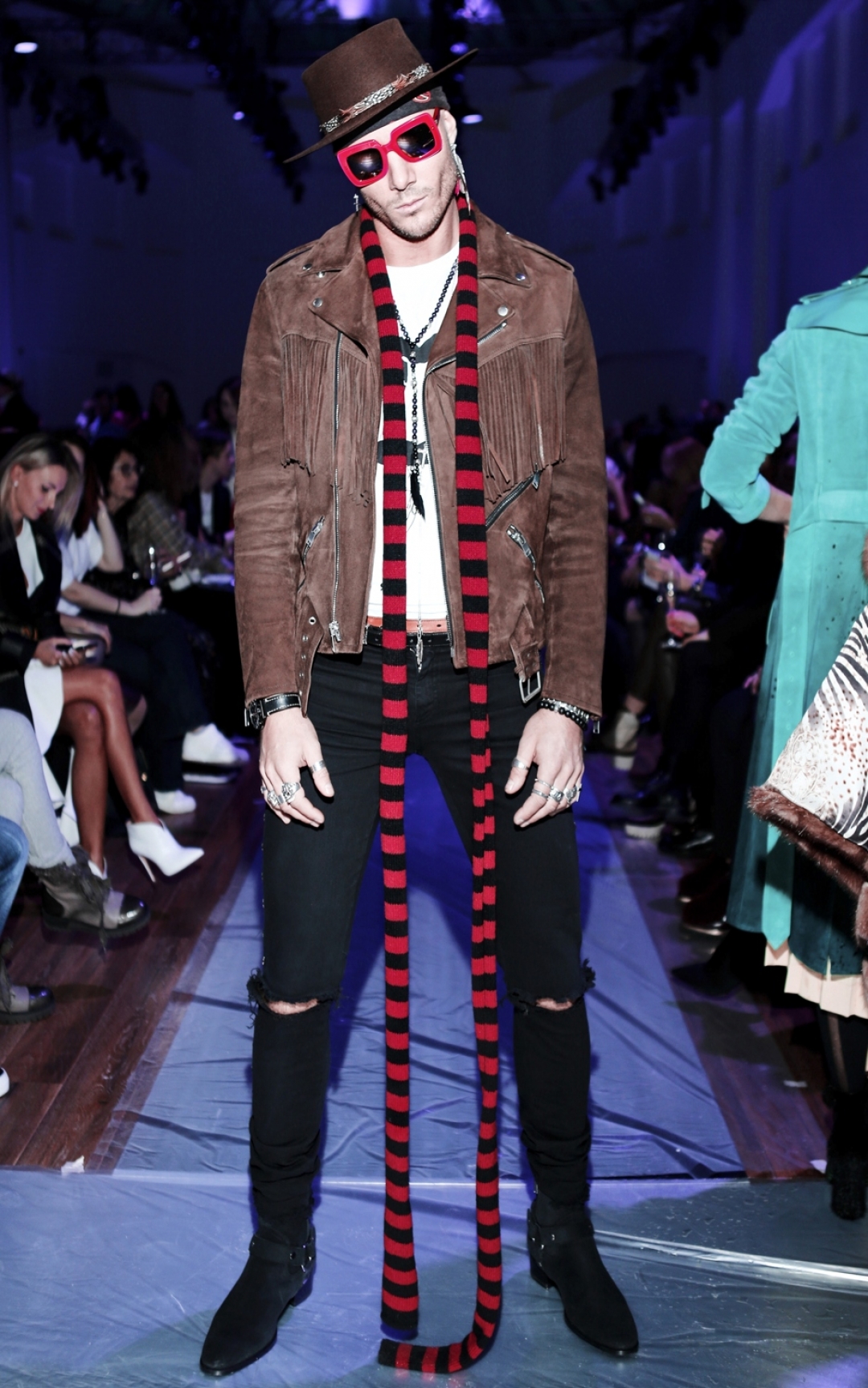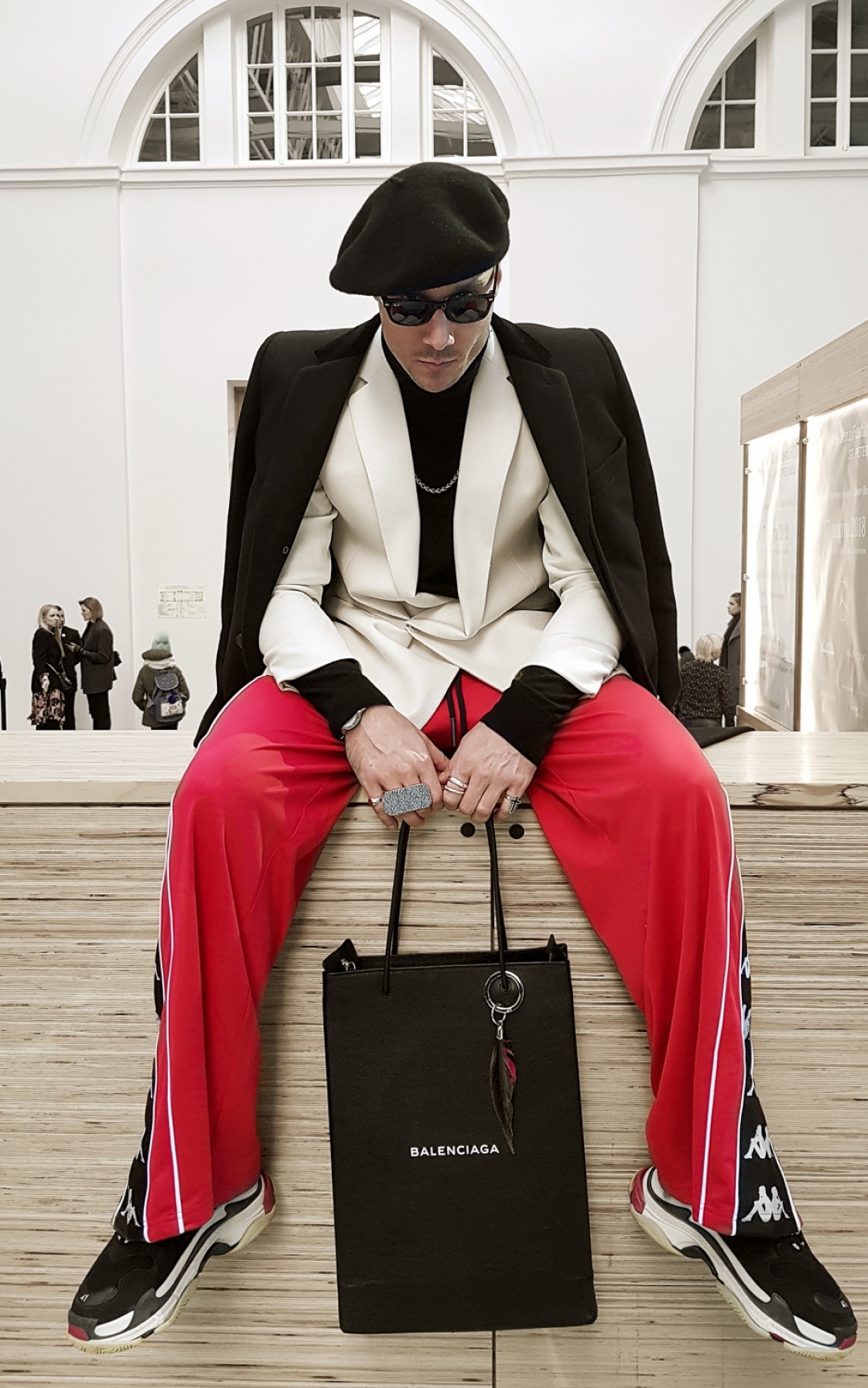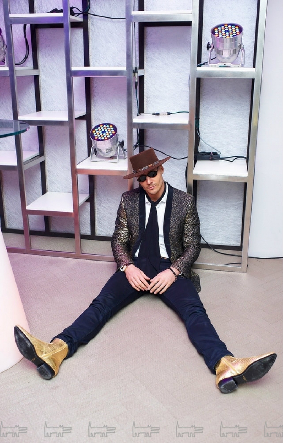 Художник не только работает в технике поп-арта и сюрреалистичного фотоколлажа, но и придерживается философии Энди Уорхола: «Я люблю быть подходящим объектом в неподходящем пространстве и неподходящим объектом в подходящем пространстве», — поэтому легко переодевается два раза за вечеринку, меняя леопардовый тотал-лук на розовую шубу и платье в пол.