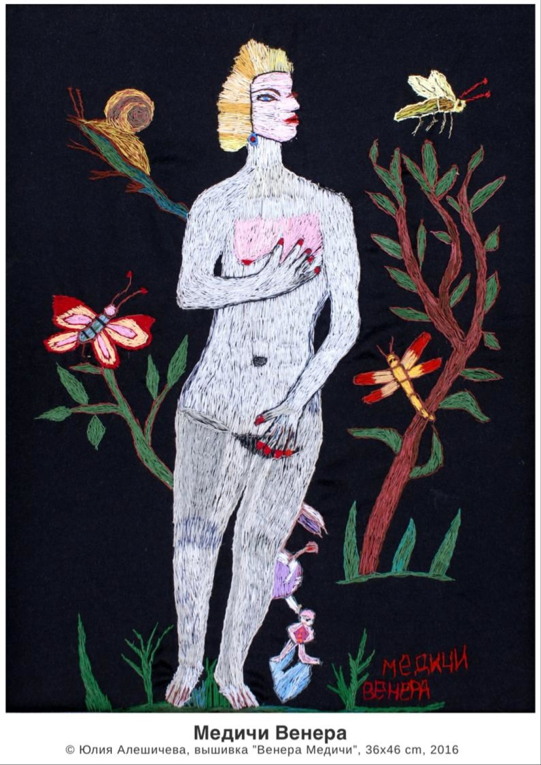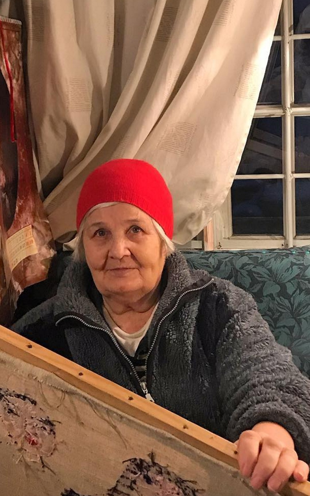 Вышиванием она захотела заниматься сама, никто ее к этому не подталкивал. Начала с наволочек на подушки с изображением цветов — находила у себя газеты и календари с красивыми картинками, распускала нитки из трикотажных кофт и принималась за работу. Потом уже вышивала на любых кусках ткани, сшитых между собой, — когда у нее получилась «Русская Венера в бане», мы были в восторге, смеялись, поняли, что у нее есть собственный стиль и видение картин. Вышивание во многом помогает ей бороться с деменцией: она расслабляется, улыбается, радуется жизни несмотря на свою довольно непростую судьбу.