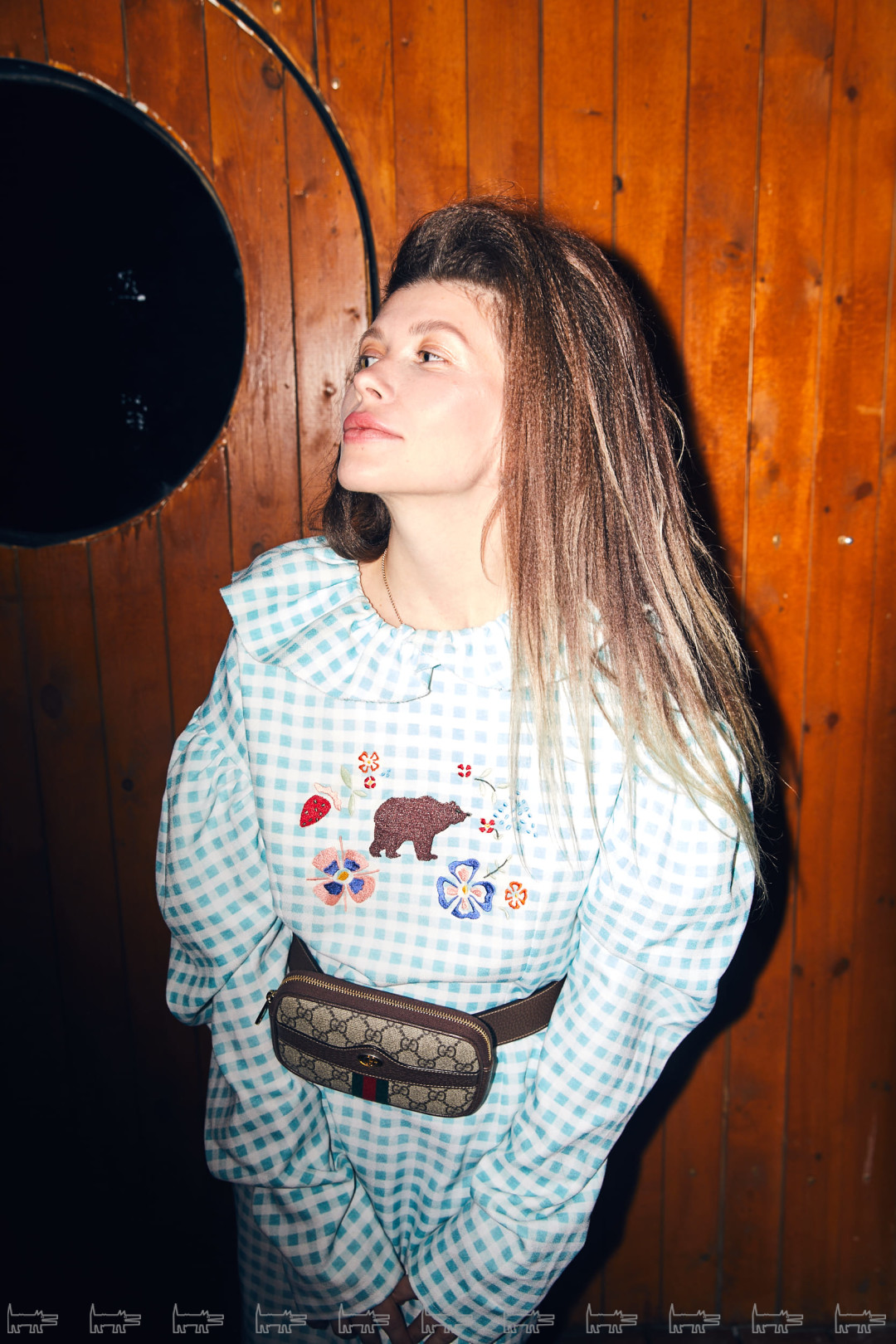 На Алене: платье 404 NOT FOUND, туфли Saint Laurent, сумка Bottega Veneta