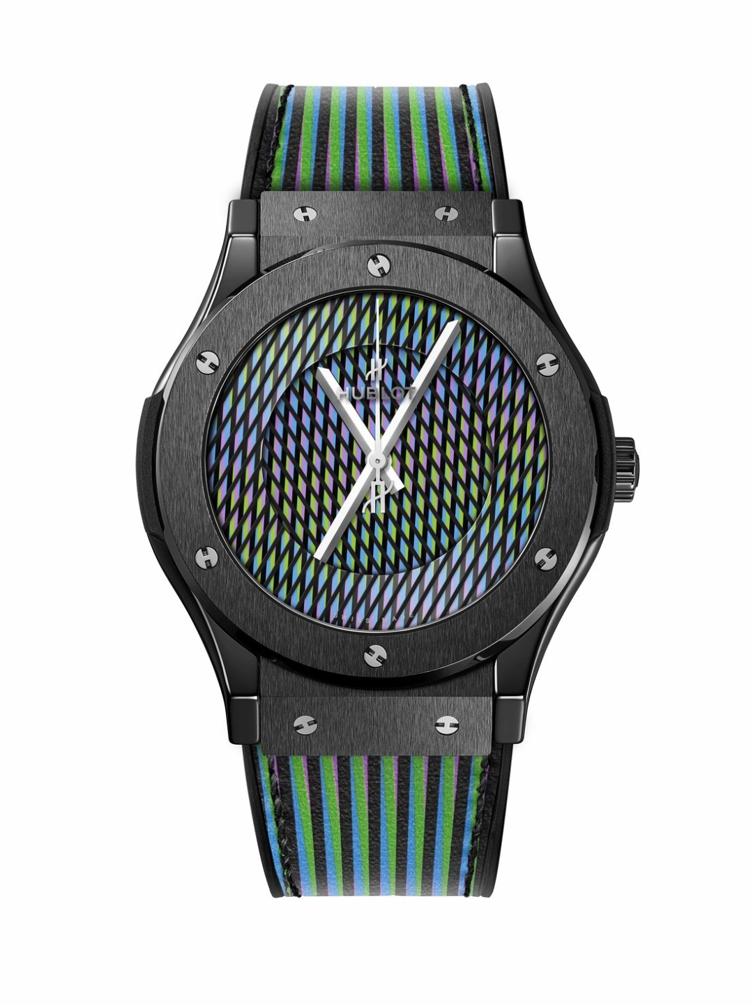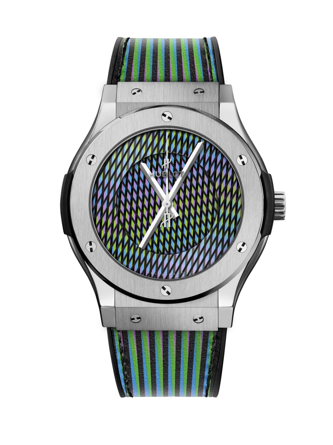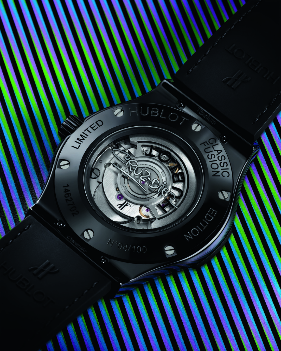 Часы вдохновлены его проектом Chromointerférence 1964 года. Они выпущены в нескольких версиях: в корпусах двух диаметров (45 и 38 мм) в трех материалах — 100 и 25 экземпляров из титана, 30 и 20 — из золота King Gold, а также 100 и 25 из черной керамики. Циферблат, выполненный в цветах из палитры Pantone, имеет два уровня, с часовой стрелкой на первом и минутной на втором. Диски на двух уровнях вращаются, создавая неповторимые узоры. Задняя крышка украшена автографом художника, что делает их фактически коллекционной вещью.