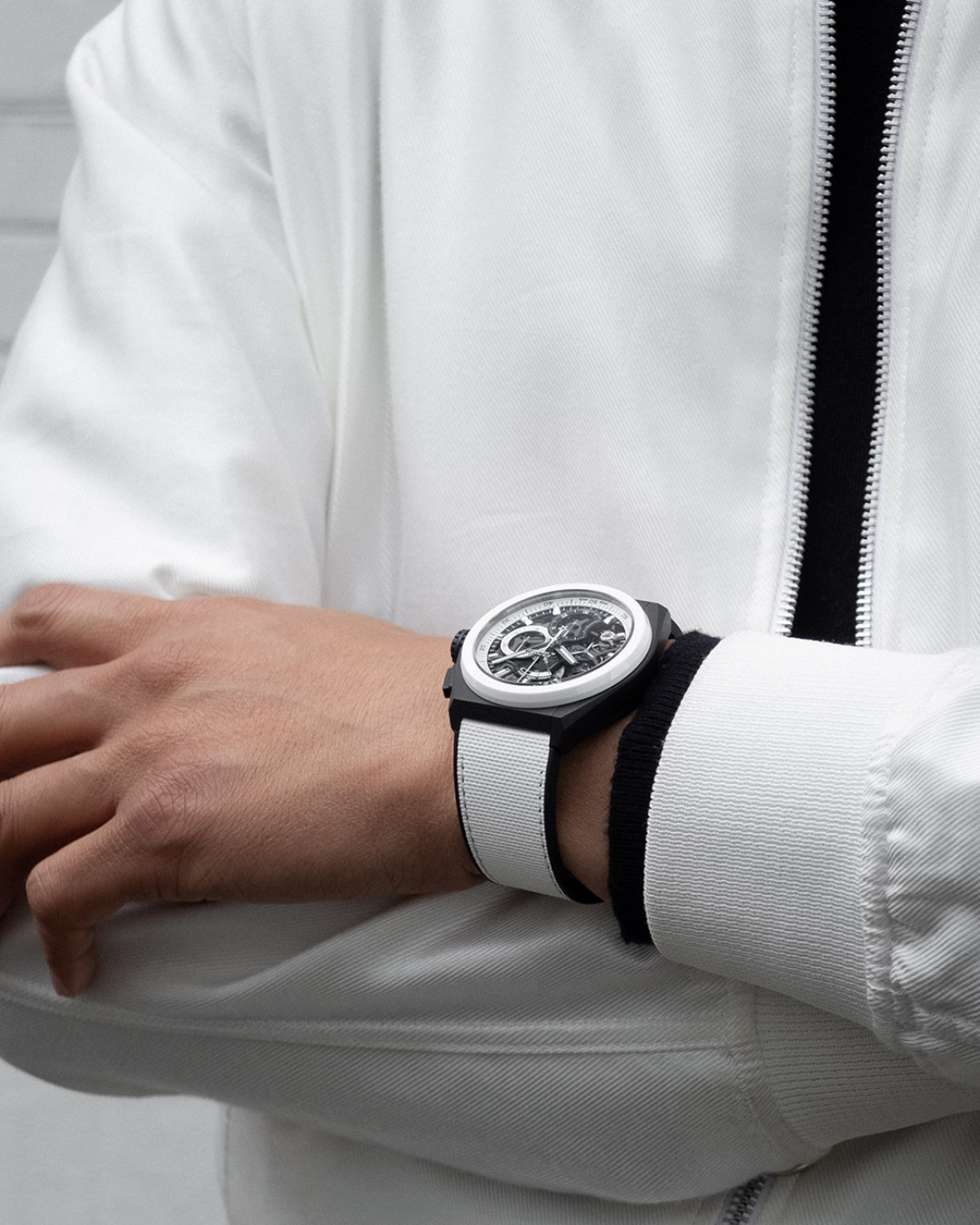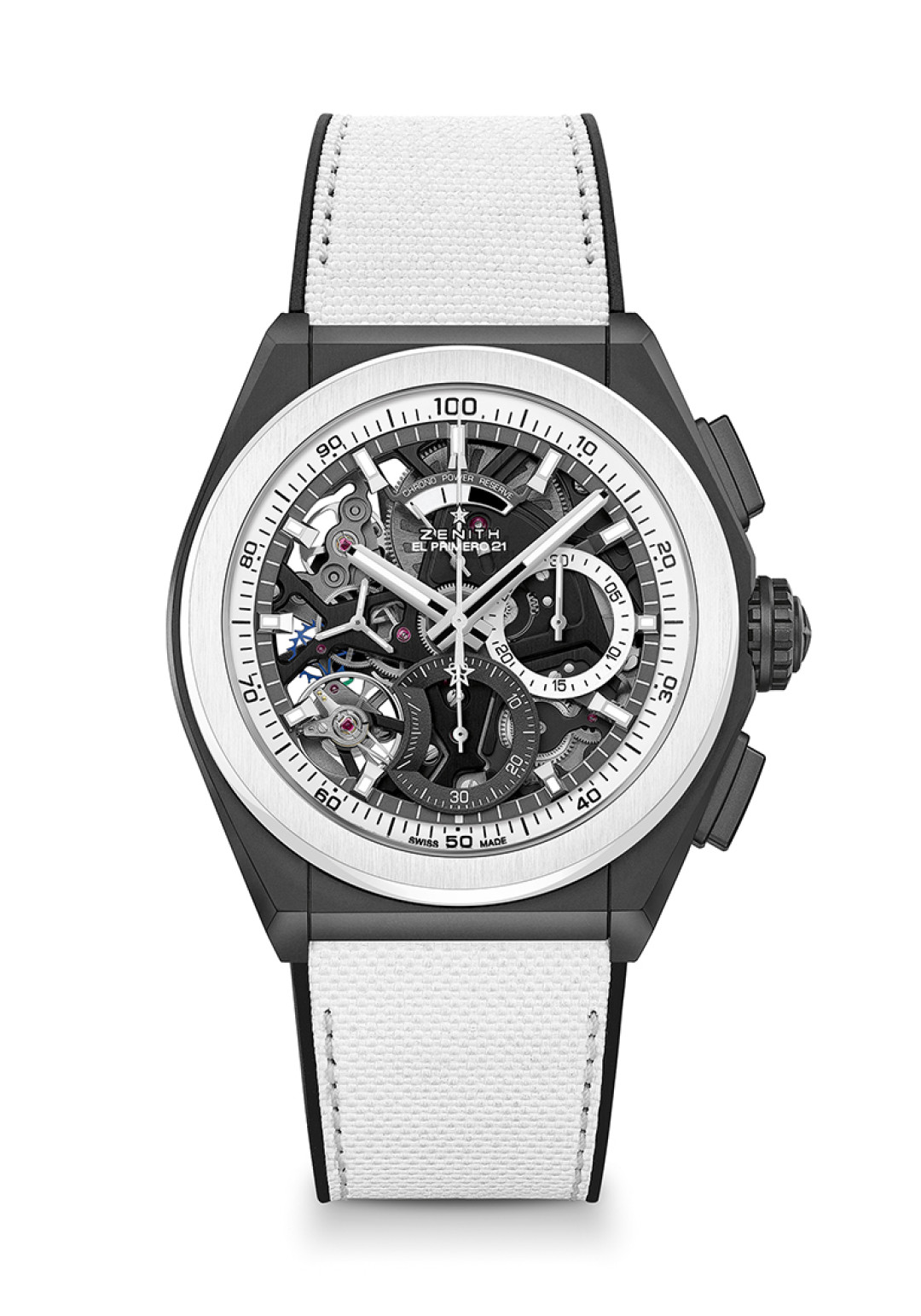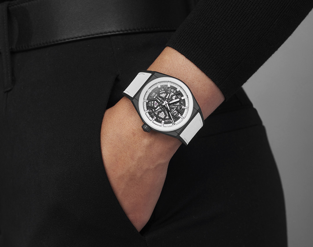 Сочетание черного и белого – это гораздо больше, чем просто выбор оттенков. Это язык дизайна, излюбленный современными художниками контраст, это напоминание о динамичных городских пейзажах. Обе модели, трехстрелочник Zenith Defy Classic и хронограф с точностью до 1/100 секунды Defy 21, помещены в корпус из черной керамики с матовой обработкой, а безели выполнены в белом. Дополняет дизайн часов черно-белый резиновый ремешок с эффектом кордуры (высокотехнологичная ткань, когда-то бывшая военной разработкой) – но при желании можно придать часам более лаконичный вид, заменив его на черный из текстурированного каучука.