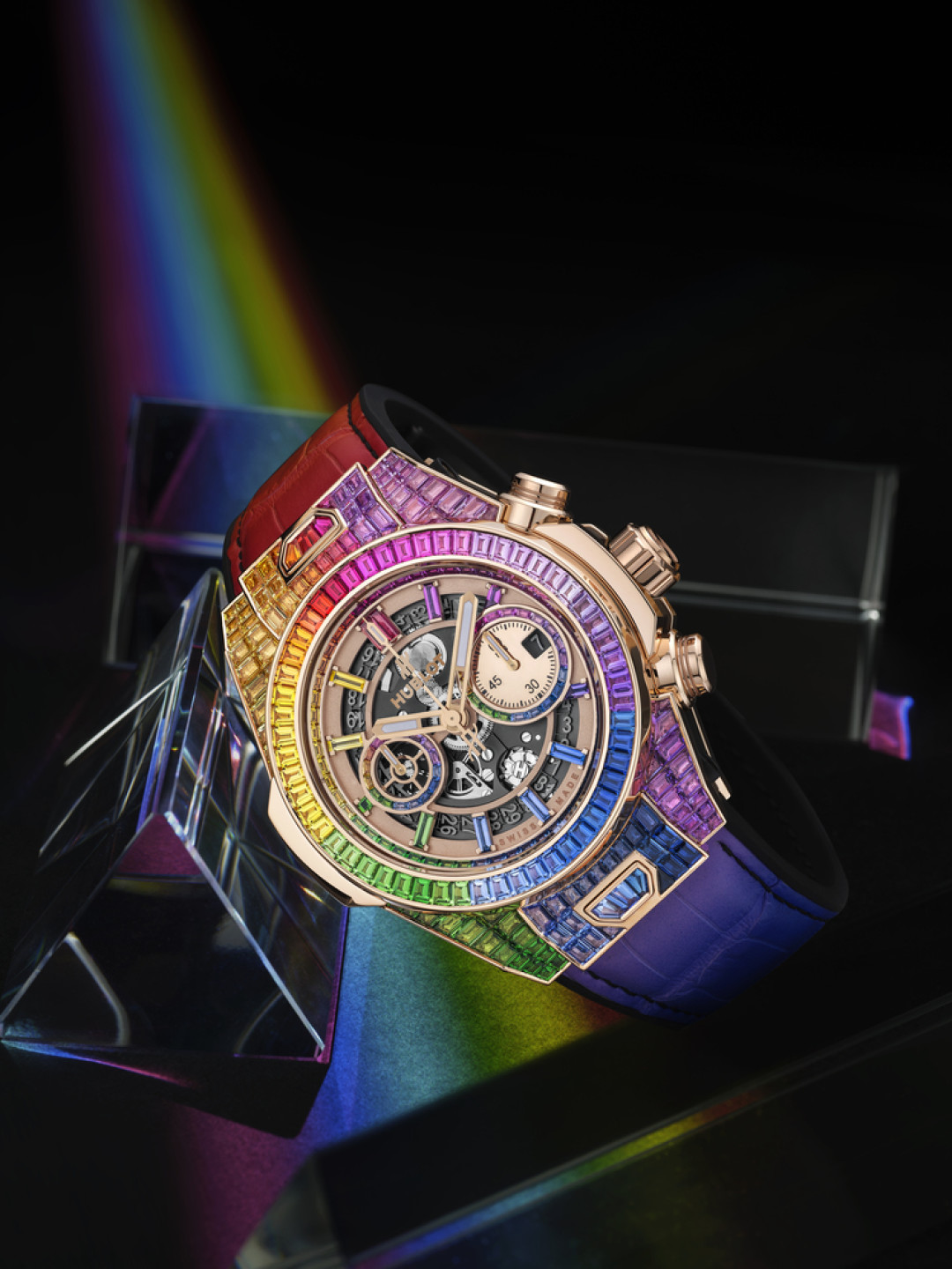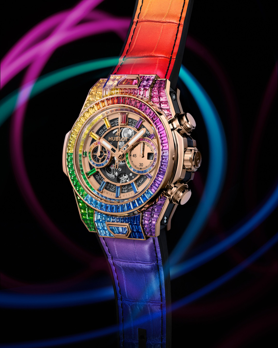 Когда ювелирное искусство встречается с часовым, рождается поэзия. И специалисты Hublot, как настоящие художники, воплотили в новинке Big Bang Unico Full Baguette King Gold Rainbow образ летнего неба после шторма, когда на фоне розовеющих облаков появляется яркая радуга: корпус из 18-каратного розового золота украшен 290 драгоценными камнями всех оттенков. Сияющую композицию составляют алые рубины, розовые, голубые желтые и оранжевые сапфиры, аметисты, топазы и цавориты. Новая модель Big Bang, переливающаяся яркими красками, – это настоящий символ оптимизма, в котором сейчас мы нуждаемся как никогда, поэтому часы станут отличным подарком близкому или себе любимому.