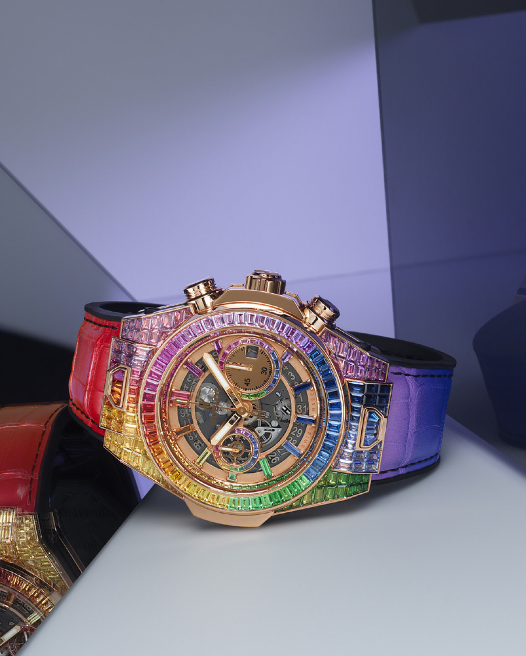 Багетная огранка подчеркивает сияние камней и создает эффект деграде, когда один цвет плавно перетекает в другой. Для создания такой гармоничной градации цвета потребовались кропотливость, опыт и сноровка. Лучшие инженеры и геммологи работали вместе, чтобы создать конструкцию, в которой розового золото ровно столько, чтобы деликатно обрамить сияние роскошных камней и подчеркнуть контуры механизма. Радуга простирается и на ремешок из кожи аллигатора и натурального каучука с пряжкой, инкрустированной 30 драгоценными камнями.