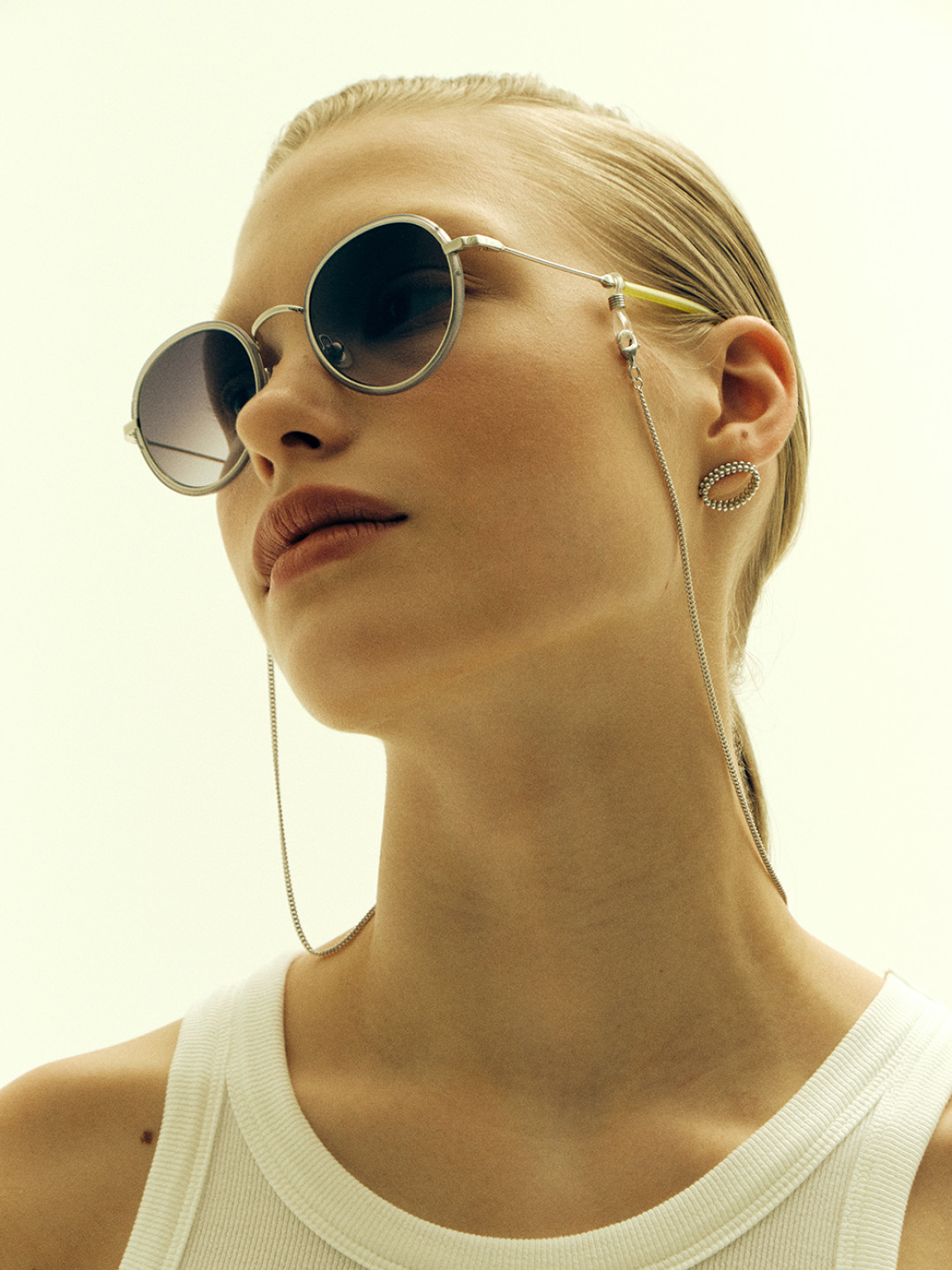 В нее вошли солнцезащитные очки и оправы для них, вдохновленные британскими 80-ми. Среди моделей — варианты с бутылочно-зелеными линзами, серебряными цепочками, которые можно носить и как обычные цепи, желтыми элементами, отсылающими к фирменному цвету Avgvst. Всего в коллекции семь моделей.