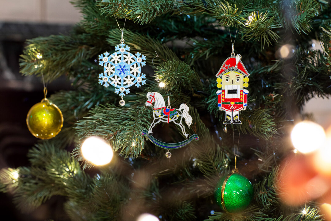 Для главного декабрьского украшения Гранд Отеля Европа – шестиметровой елки – Императорский ювелирный дом «Русские самоцветы» создал эксклюзивную коллекцию новогодних игрушек. В своём дизайне мастера использовали легендарные традиции Карла Фаберже: они переложили оформление классических серебряных игрушек на фольгированную поверхность, вручную расписанную эмалью и украшенную стразами и корундами.