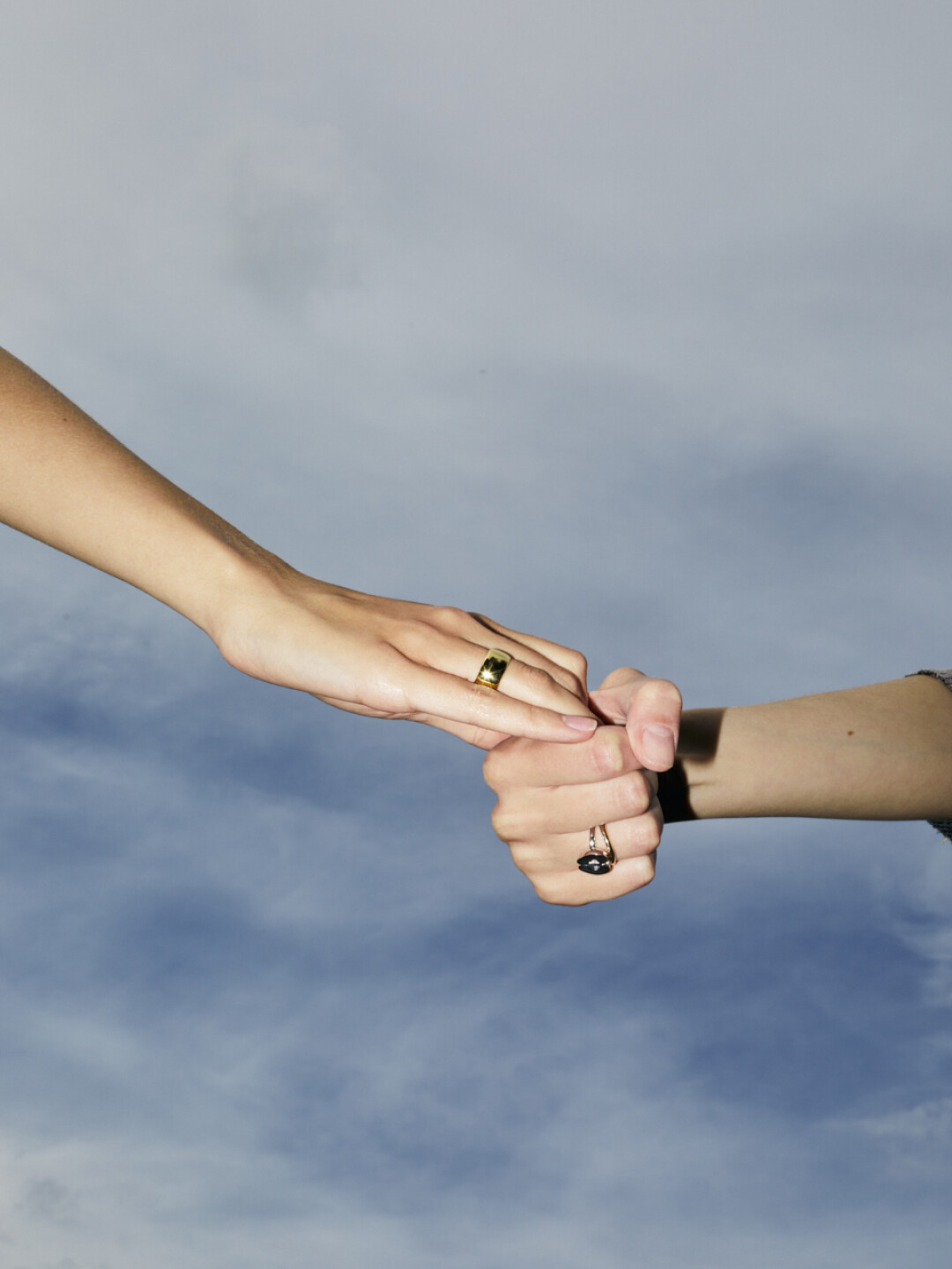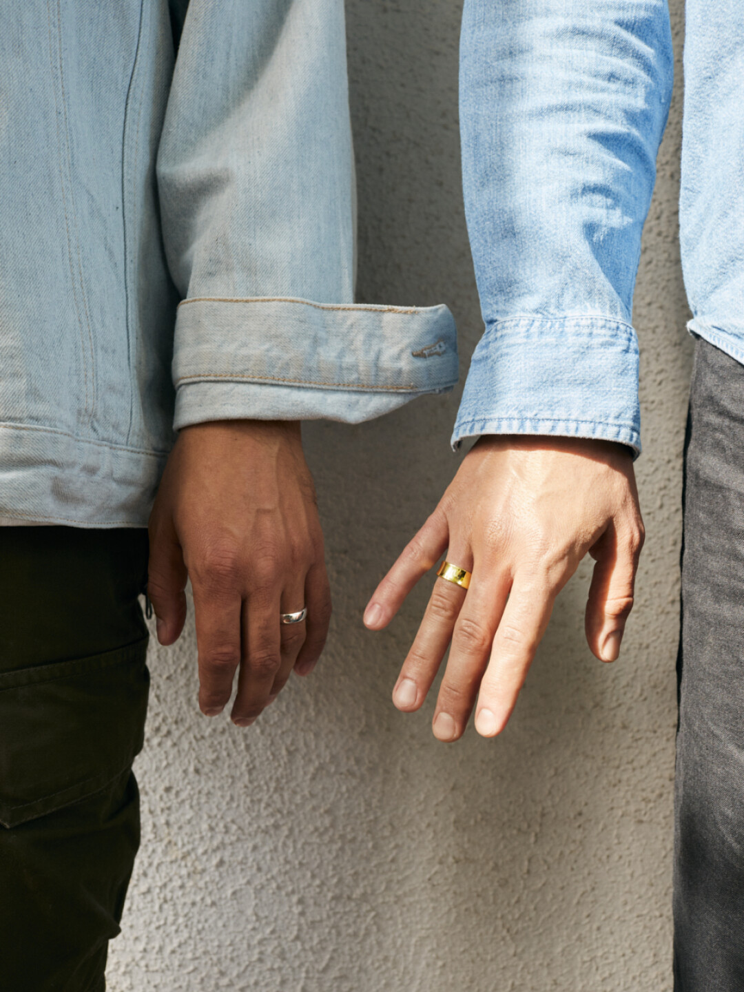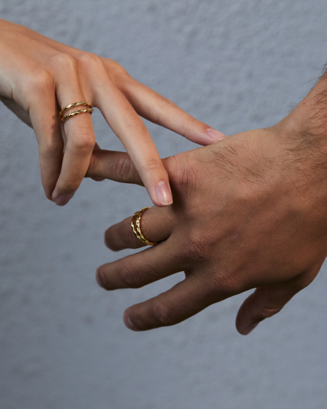Дизайн новинок — это оммаж сентиментальным кольцам XIV–XVI веков с выгравированными посланиями. Всего в коллекции четыре базовых украшения: вогнутое кольцо-арка, кольцо с восемью плавными гранями, «фламандское» кольцо, будто с картины Лукаса Ван Лейдена, и кольцо-мюзле, закрученное на манер проволоки от игристого. Есть варианты в белом или лимонном золоте и разной ширины. Avgvst не делят кольца на мужские и женские, именно поэтому украшения называются партнерскими.