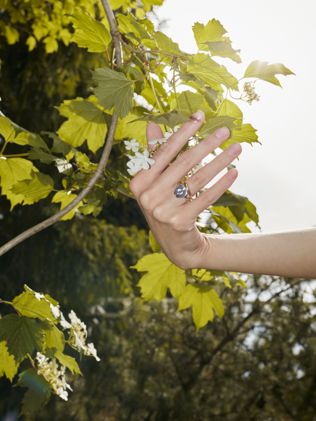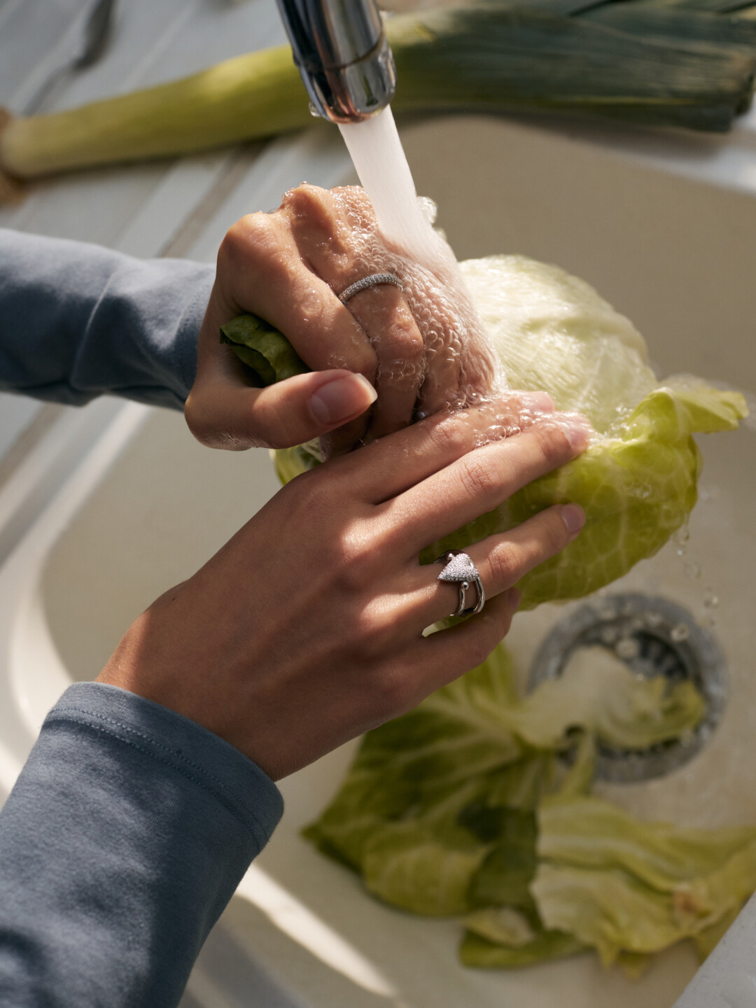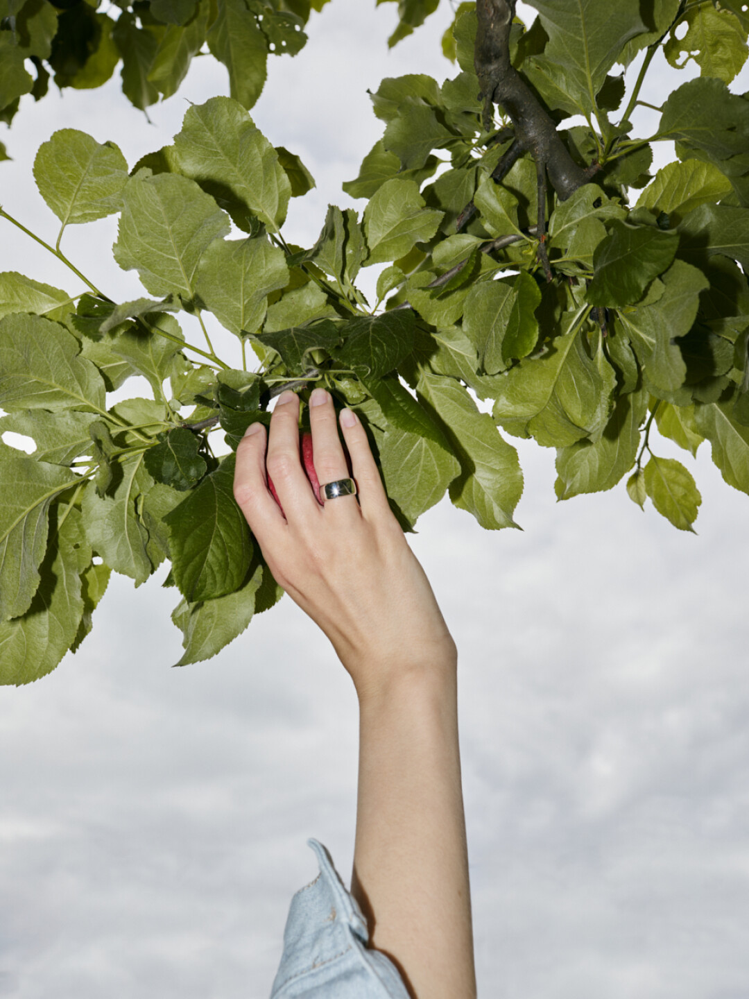 Дизайн новинок — это оммаж сентиментальным кольцам XIV–XVI веков с выгравированными посланиями. Всего в коллекции четыре базовых украшения: вогнутое кольцо-арка, кольцо с восемью плавными гранями, «фламандское» кольцо, будто с картины Лукаса Ван Лейдена, и кольцо-мюзле, закрученное на манер проволоки от игристого. Есть варианты в белом или лимонном золоте и разной ширины. Avgvst не делят кольца на мужские и женские, именно поэтому украшения называются партнерскими.