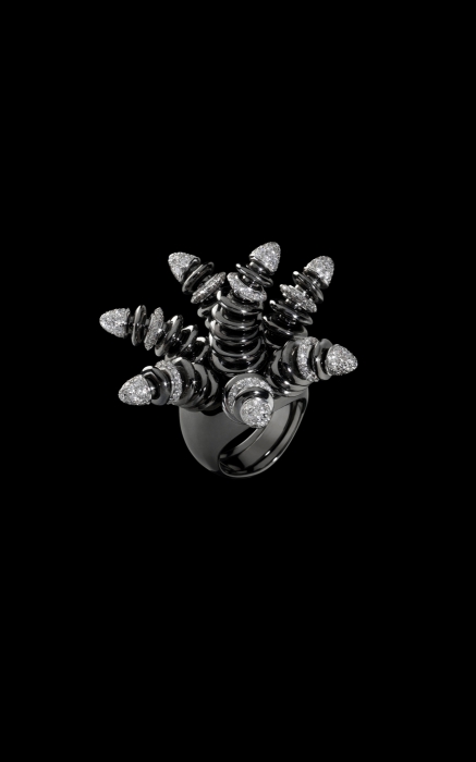 Подвижные черные гусенички из родированного золота с бриллиантами общим весом 2,56 карата придумал промышленный дизайнер Массимилиано Боноли, а воплотил победитель Couture Design Awards Маттиа Чьело.