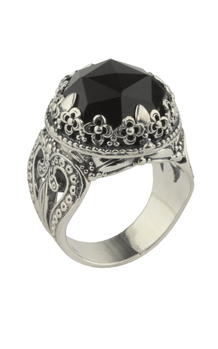 Черный купол шпинели опирается на две серебряные накладки с завитками. Греческий ювелир поддержал отечественного производителя и сделал их похожими на волюты ионической колонны.
