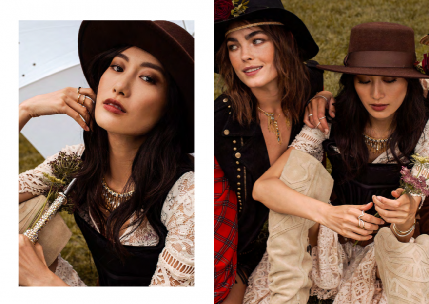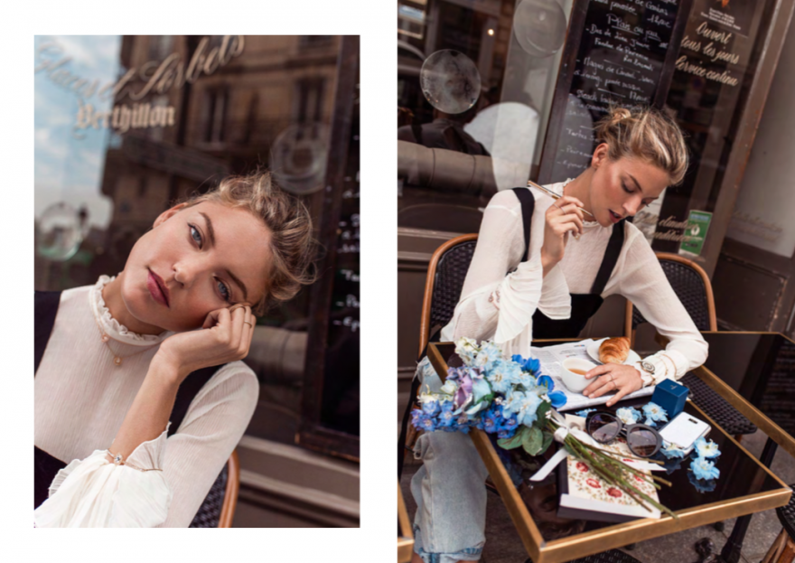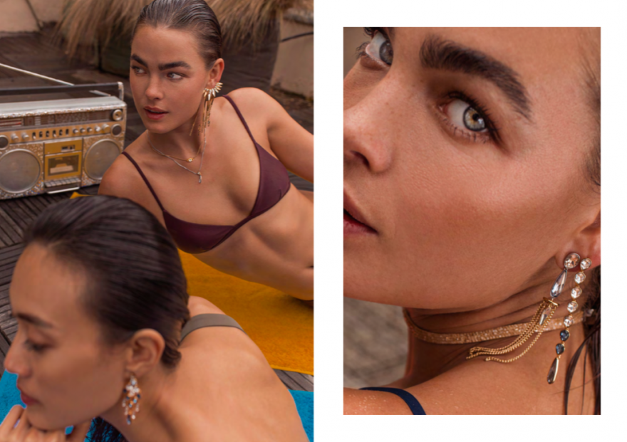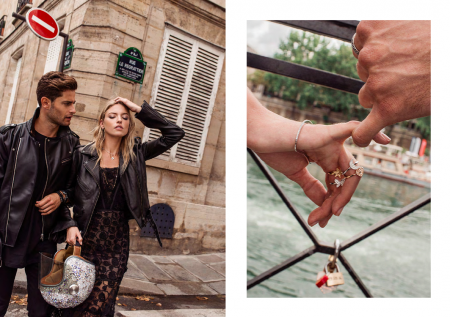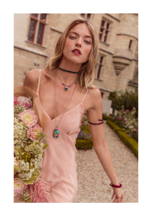 От первого города украшениям достались цветочная палитра, силуэты Эйфелевой башни и пирамид Лувра, от второго — плавные силуэты в стиле gypset, принты с пальмами, а также янтарные тона в духе неспешных калифорнийских закатов.