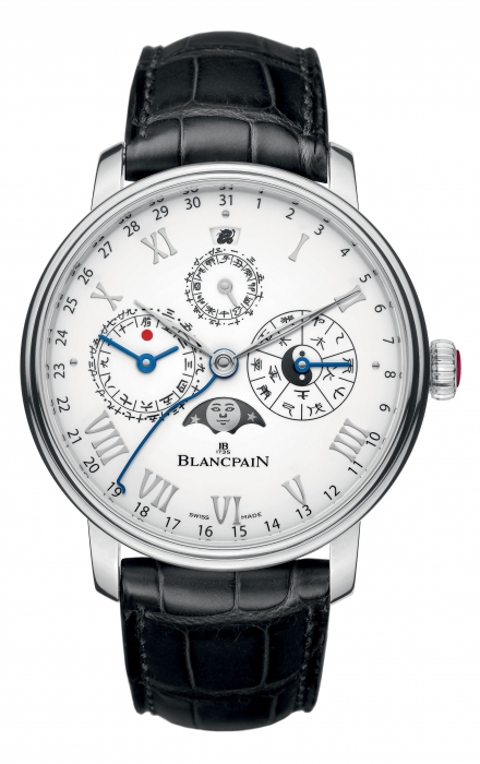 Швейцарская марка Blancpain выпустила лимитированную коллекцию часов — с китайским календарем, знаками зодиака и индикаторами фаз луны. Корпус новой модели изготовлен из платины, заводная головка увенчана рубином, основные стрелки имеют форму вырезанных листьев, а «змеевидный» указатель даты по Григорианскому календарю выполнен из вороненой стали. У всех часов этой ограниченной серии (она состоит всего из 50 экземпляров) ротор сделан из белого золота с выгравированной на нем собакой — символом наступившего года.