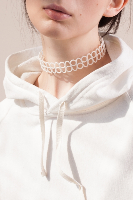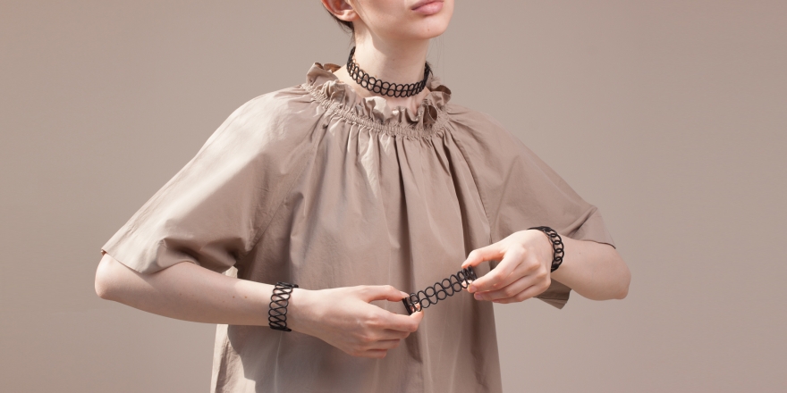 Смотреть действительно есть на что — круглые части сережек с переливающимися космическими вкраплениями соединены невидимой силиконовой нитью и крепятся к ушам на швензы из медицинской стали. Благодаря такой фурнитуре, которая не окисляется и не теряет вид, украшения можно носить не только пару сезонов, но и несколько лет. «Обнимающие» чокеры и браслеты, в свою очередь, выполнены профессиональной промышленной 3D-печатью полиамидом и прочно держатся на руке и шее благодаря магнитам.