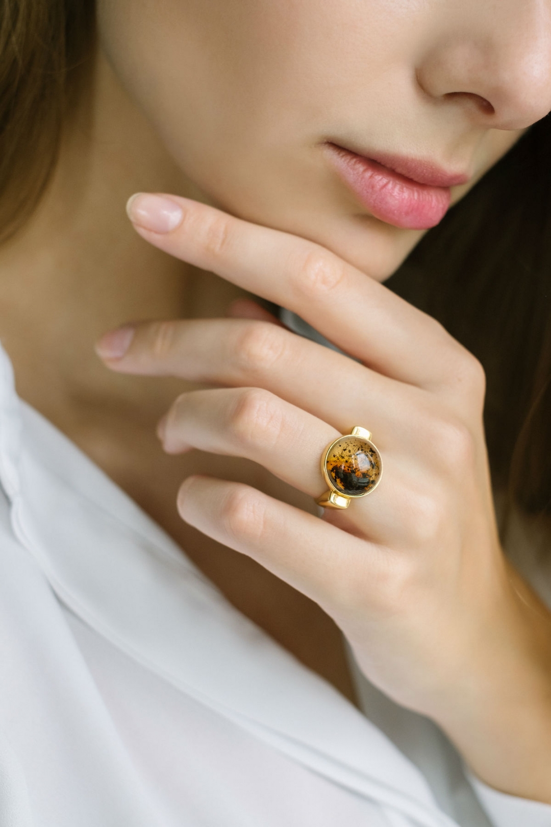 О связи с морем напоминает и дизайн выпущенного кольца: в прозрачном янтаре есть органические включения — частицы растений и земли, которые образуют тонкие акварельные узоры золотистых, зеленоватых и черных оттенков. Миллионы лет назад (возраст балтийского янтаря оценивается в 44 млн лет) такие включения оказались в древесной смоле, которая в итоге попала в море и затвердела. Многообразие цветов и переливов внутри янтаря делает каждый камень уникальным, а классическая перстневая оправа добавляет кольцу строгости и современности.