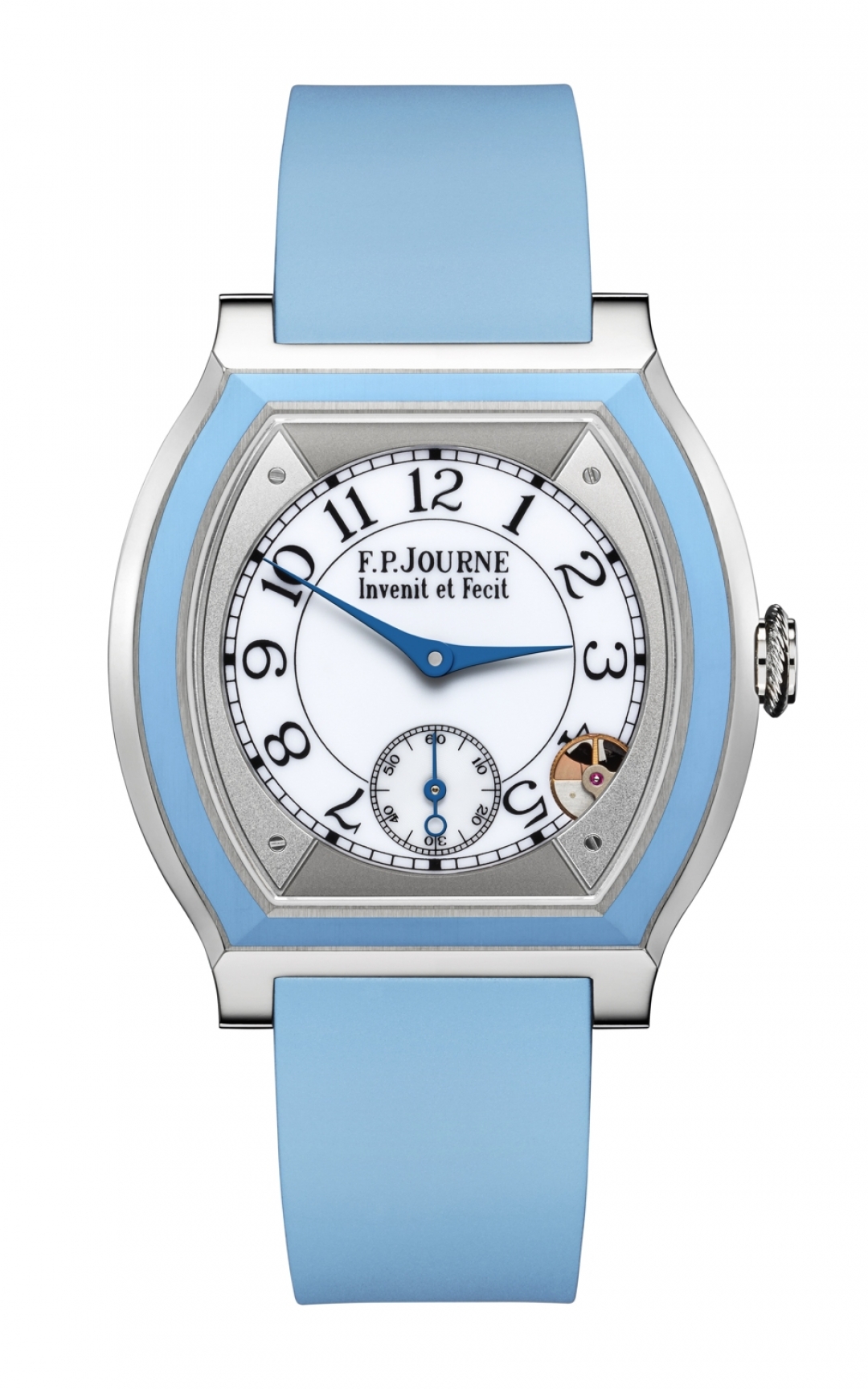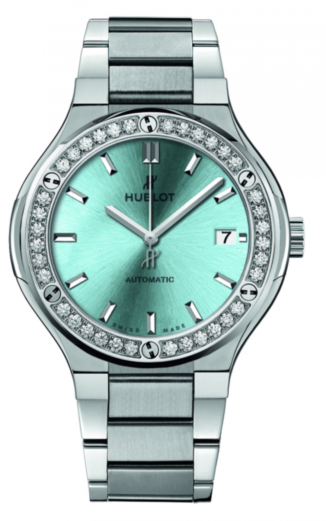 Голубой циферблат женских часов из титана с 42-часовым запасом хода окружают 36 бриллиантов общим весом 1,2 карата.