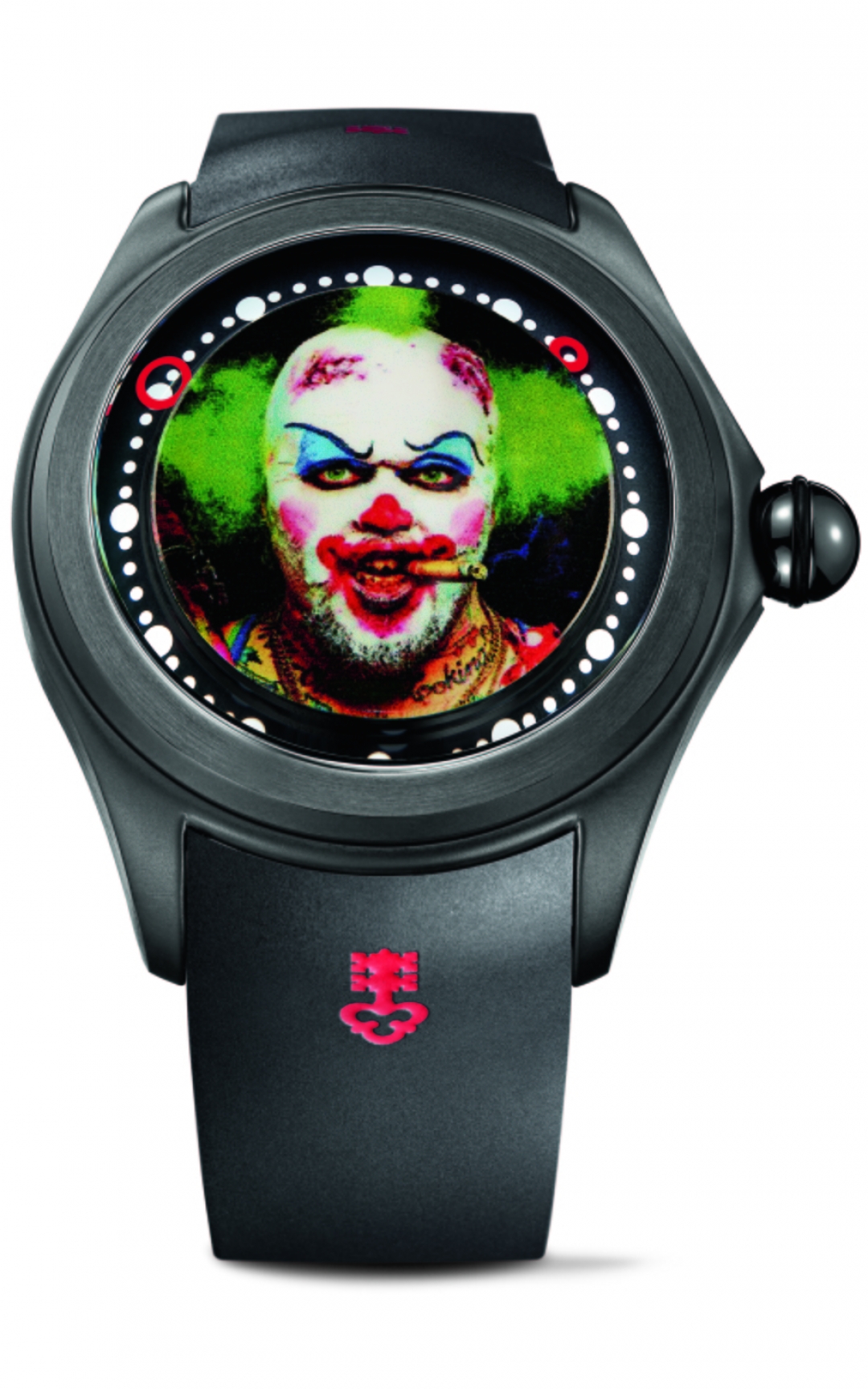 Клоун в законе от мастера дарк-арта американского художника Мэтта Барнса оторвал и выбросил с этого внушительного (52 миллиметра!) циферблата стрелки — так что следим за временем по красным кружкам на внутреннем ободке.