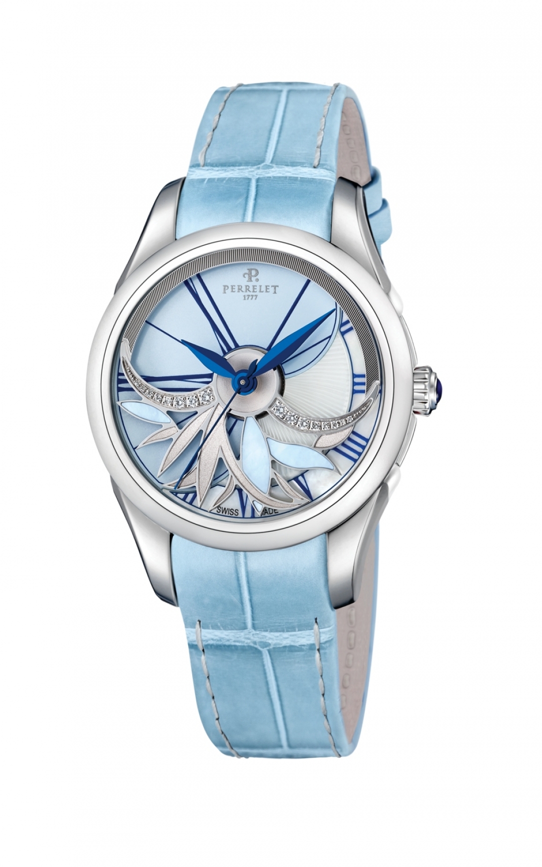 Калибр Double Rotor P-181 часовщики запатентовали в 1995 году. Вместо одного грузового сектора, который вращается вокруг оси при каждом движении руки и так подзаводит механизм, они установили два. Второй, как маятник гипнотизера, качался прямо на циферблате. Свое 21-летие двойной ротор Perrelet отметил, одевшись в черно-белые перья, лепестки и бриллианты: если уж кружиться, то максимально драматично! Теперь узоры стали нежнее. Они тонко вырезаны из стали, родированы и подбиты голубым перламутром.