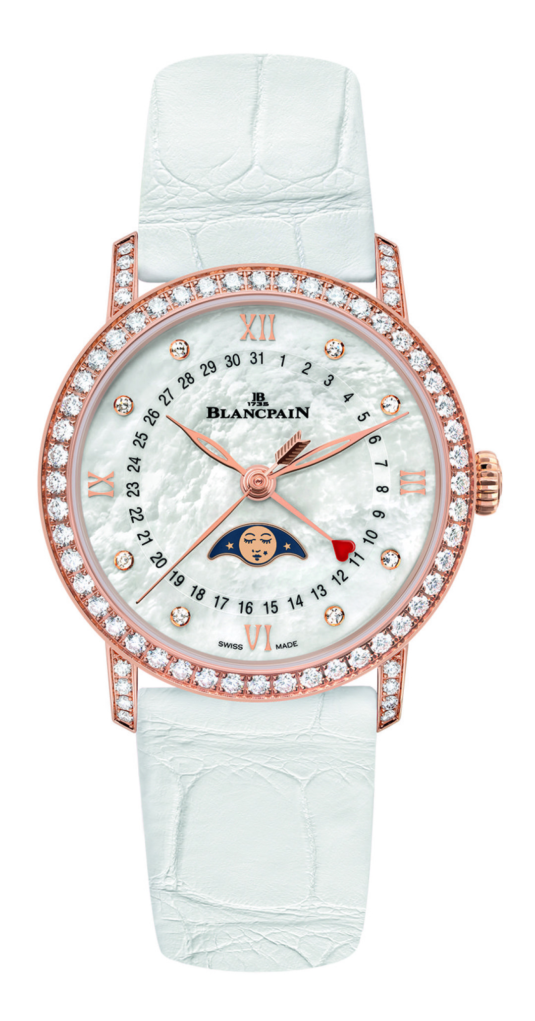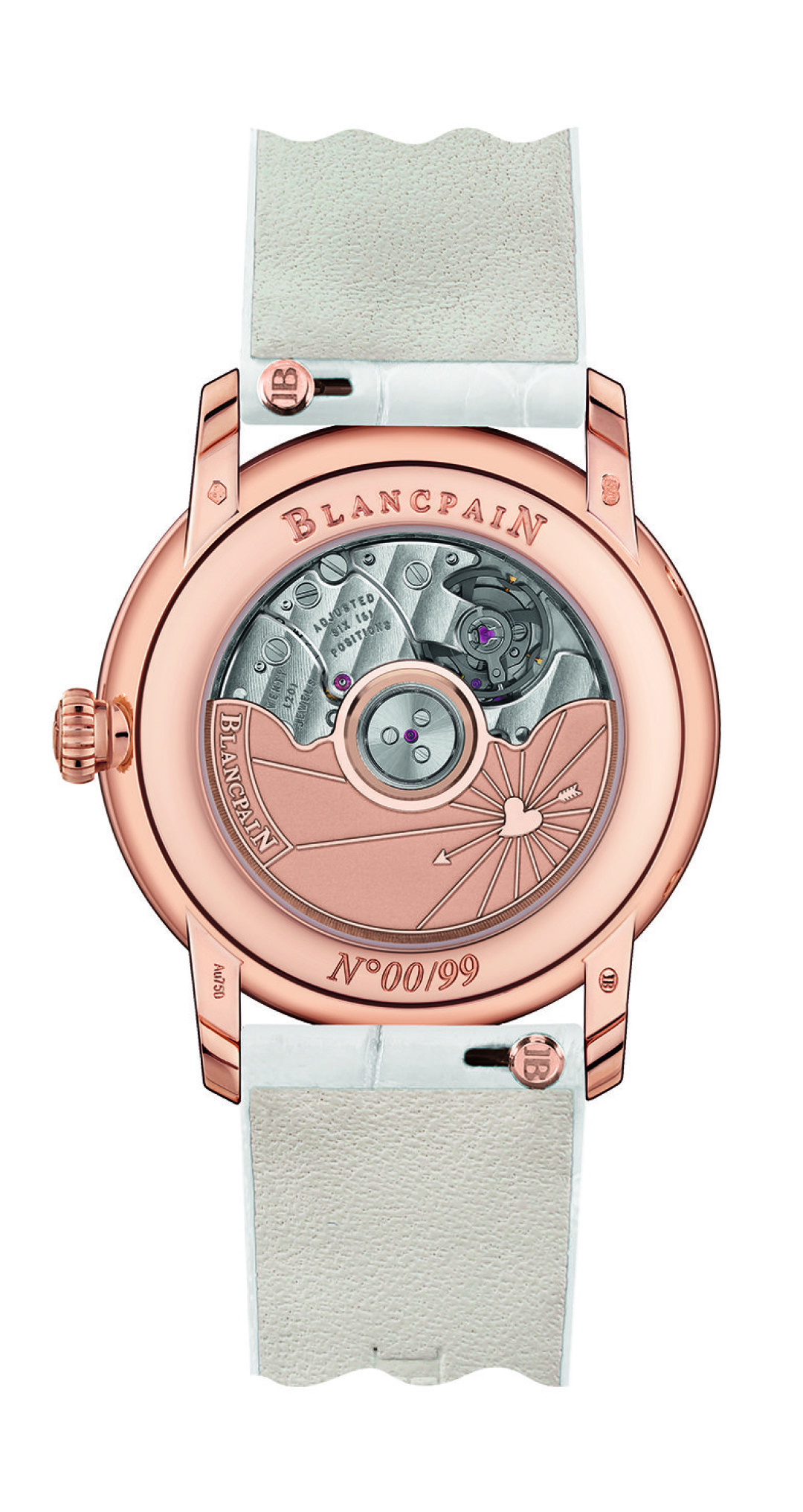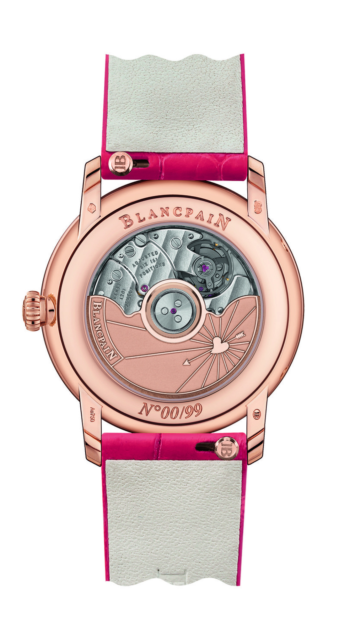 Часы оснащены автоматическим механизмом 913QL.P с 40-часовым запасом хода, заключенным в 33-миллиметровый корпус из красного золота с 64 бриллиантами круглой огранки. Рассмотреть его можно благодаря прозрачной задней крышке, украшенной изображением пронзенного стрелой сердца. Blancpain Villeret Women Quantieme Phases de Lune продаются с двумя сменными ремешками розового и белого цветов.