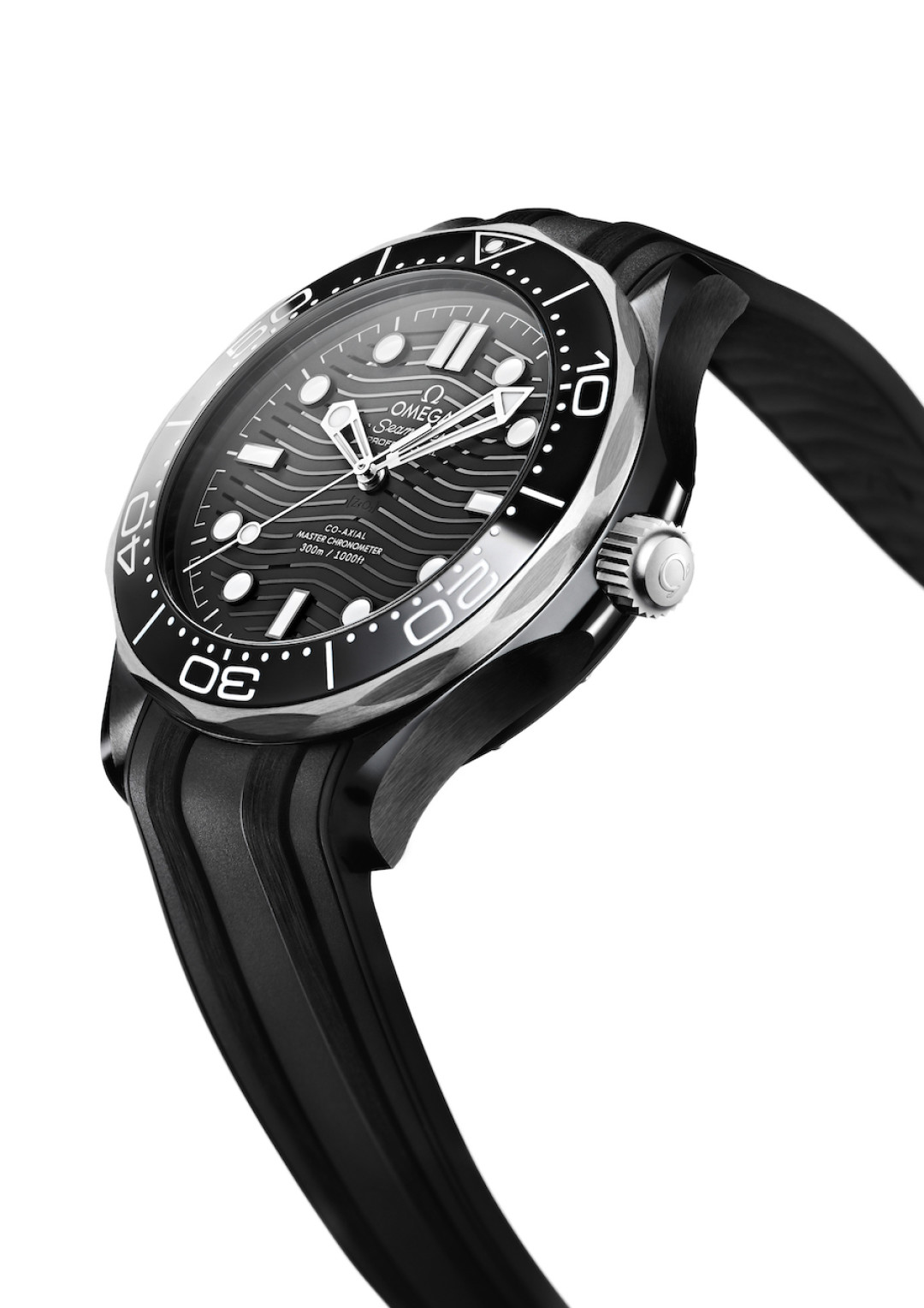 Новые часы Seamaster Diver 300M снабжены черным каучуковым ремешком с черной керамической пряжкой. С таким апргрейдом они отлично смотрятся как на красной дорожке (в сочетании с black-tie костюмом), так и на морской глубине (вместе с экипировкой дайвера).