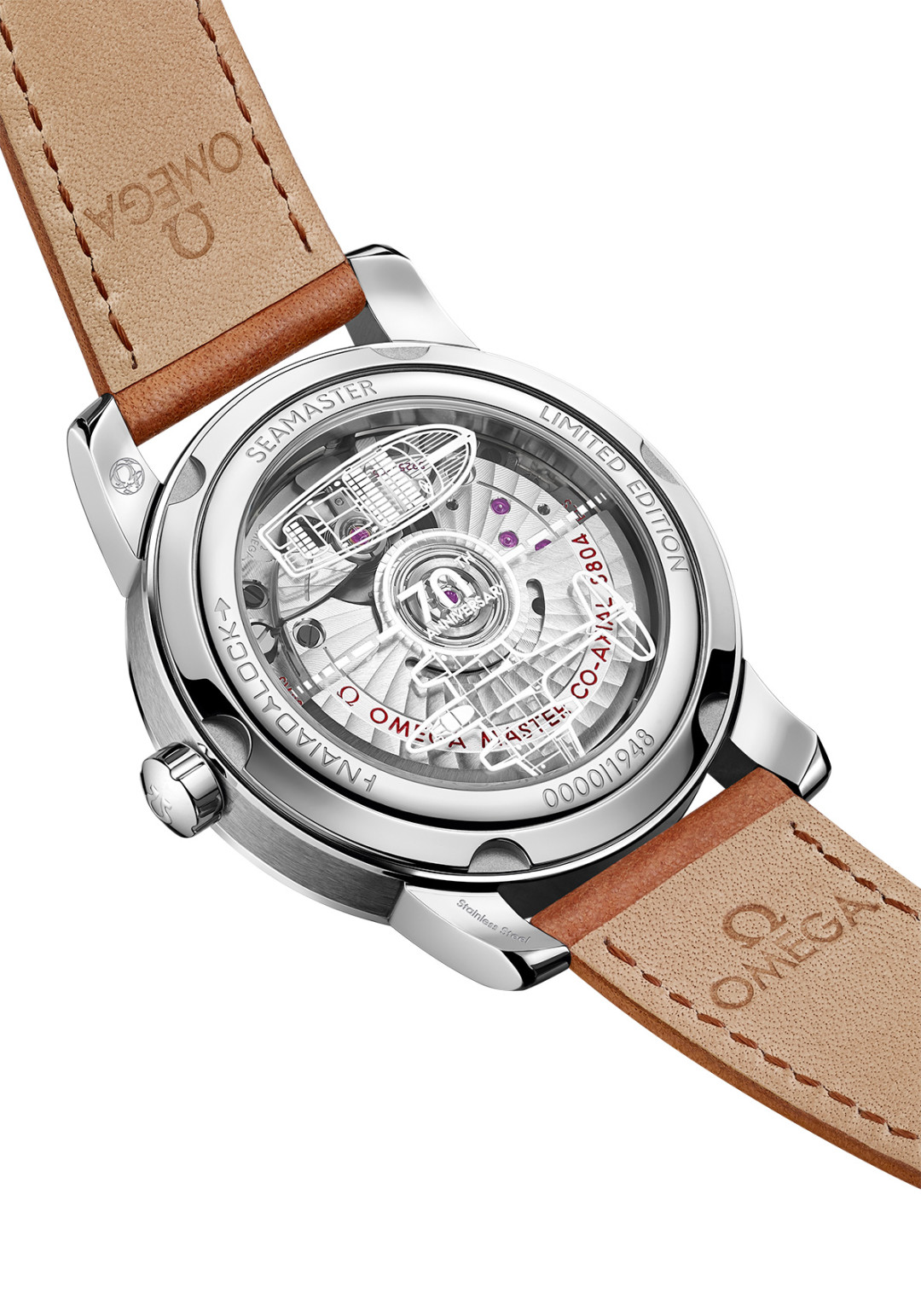 Модель Central Second из нержавеющей стали, выпущенная тиражом в 1948 экземпляров, получила матово-полированную застежку с винтажным символом бренда, выпуклые стрелки из 18-каратного белого золота и ремешок из кожи серо-голубого цвета. Модель Central Second из платины, сделанная в 70 экземплярах, отличается стрелками из 18-каратного золота SednaTM и коричневым кожаным ремешком. Кроме того, все часы новой коллекции 1948 имеют крышку с выгравированными надписями «Seamaster», «Limited Edition» и номером ограниченной серии. В честь летчиков и моряков, доверявших часам OMEGA в дни войны, плоское сапфировое стекло имеет выгравированный лазером и лакированный вручную логотип 70-летнего юбилея — изображения судна Chris-Craft и самолета Gloster Meteor, первого истребителя Королевских ВВС Великобритании.
