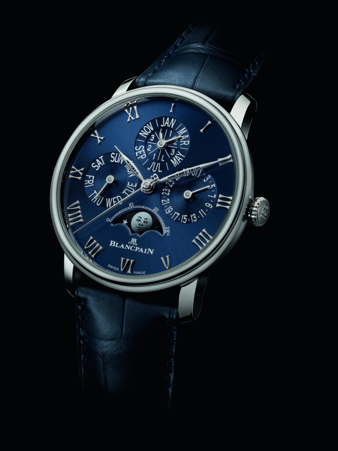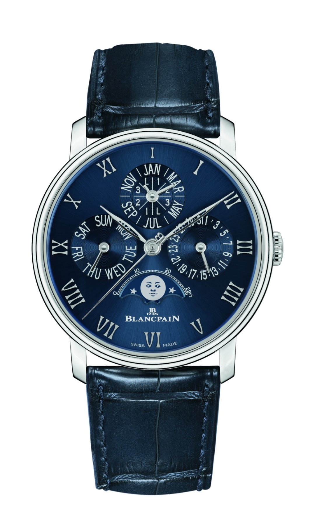 Швейцарская мануфактура Blancpain выпустила лимитированную коллекцию часов Villeret Вечный Календарь в корпусе из платины. Модель, которая не потребует корректировки до 2100 года, снабжена индикацией дня недели, даты, месяца, вискозного года и фаз Луны, которую приводит в движение автоматический калибр 5954. Индикаторы располагаются на синем циферблате, защищенном антибликовым сапфировым стеклом, а корпус, дополненный ремешком из кожи аллигатора, имеет диаметр в 40 мм и водонепроницаемость до 30 м.