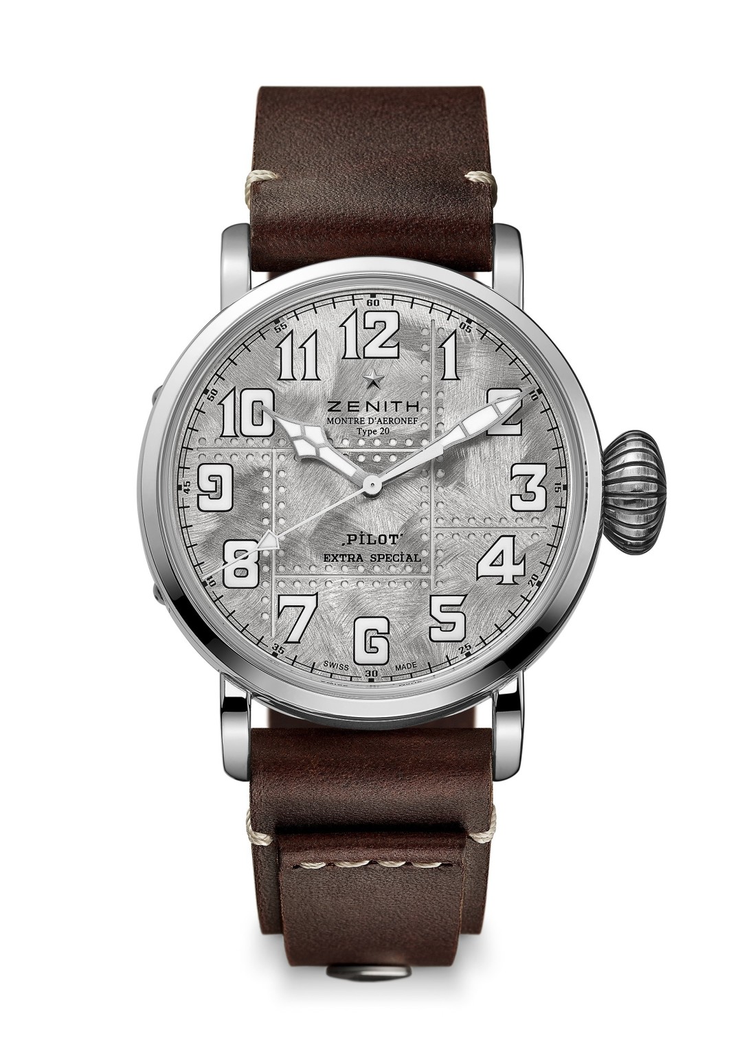 Pilot Type 20 Extra Special Silver снабжены самыми передовыми и технологичными элементами: их крупный 45-миллимитровый корпус имеет водонепроницаемость до 100 метров, а автоматический механизм Zenith Elite 679 (с 50-часовым запасом хода!) обеспечивает часам сверхточность. С собратьями по коллекции «пилоты», доступные лимитированным тиражом в 250 экземпляров, роднит крупная рифленая заводная головка и увеличенные цифры с люминесцентным покрытием — они делают часы еще более яркими и заметными (особенно на солнце!)