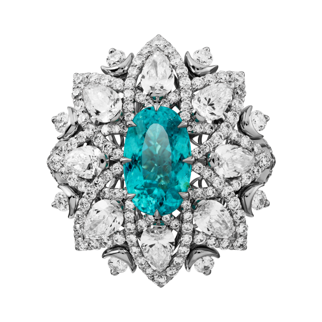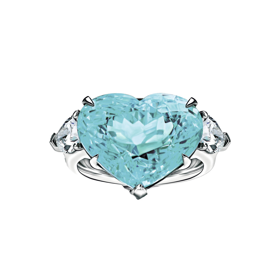 Турмалин параиба, на котором мир помешался с конца 1980-х, — единорог в мире драгоценностей. Во-первых, этот камень цвета мятной жвачки так сияет, что не отбрасывает тени (ну, почти). Во-вторых, у него единственного есть, помимо меди и марганца, настоящее золото в составе. В-третьих, каратных турмалинов параиба на свете примерно в 15 000 раз меньше, чем таких же убедительных бриллиантов. Будто бы этого недостаточно, чтобы нас поразить, но российские ювелиры смогли придать центральному камню форму сердца. Задача со звездочкой даже при работе с алмазом стала суперчелленджем в огранке гораздо более хрупкого (около 7 по шкале Мооса) турмалина параиба.