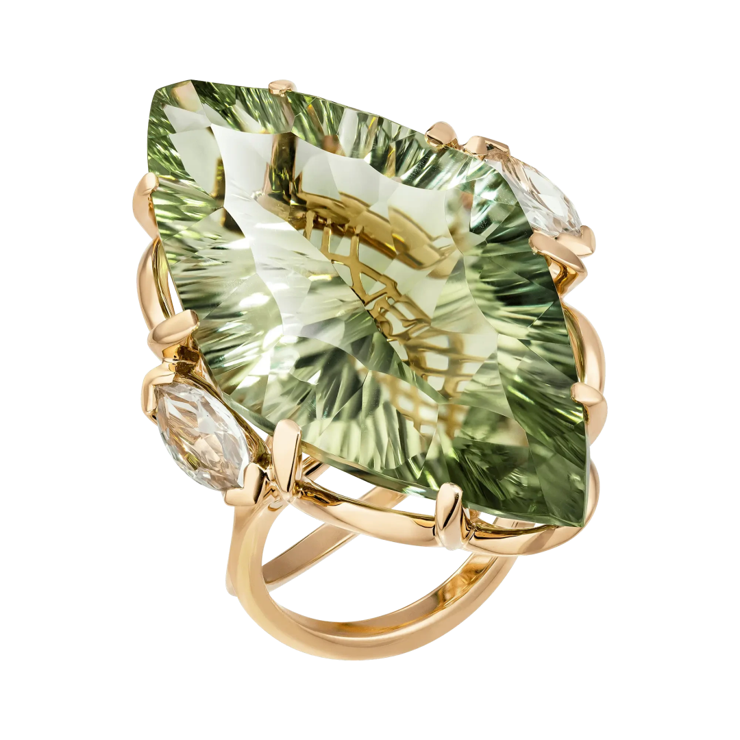 Ювелирный дом предлагает встречать наступающий год зеленого дракона в цветах, напоминающих переливы сказочной чешуи. Украшаемся перстнями, достойными Дайнерис: с голубыми аквамаринами, бирюзовыми турмалинами, темными замбийскими изумрудами и ледяными цитринами. Для самых дерзких — кольцо с огромным кварцем-празеолитом нежно-зеленого оттенка, напоминающим зрачок фантастического ящера.
