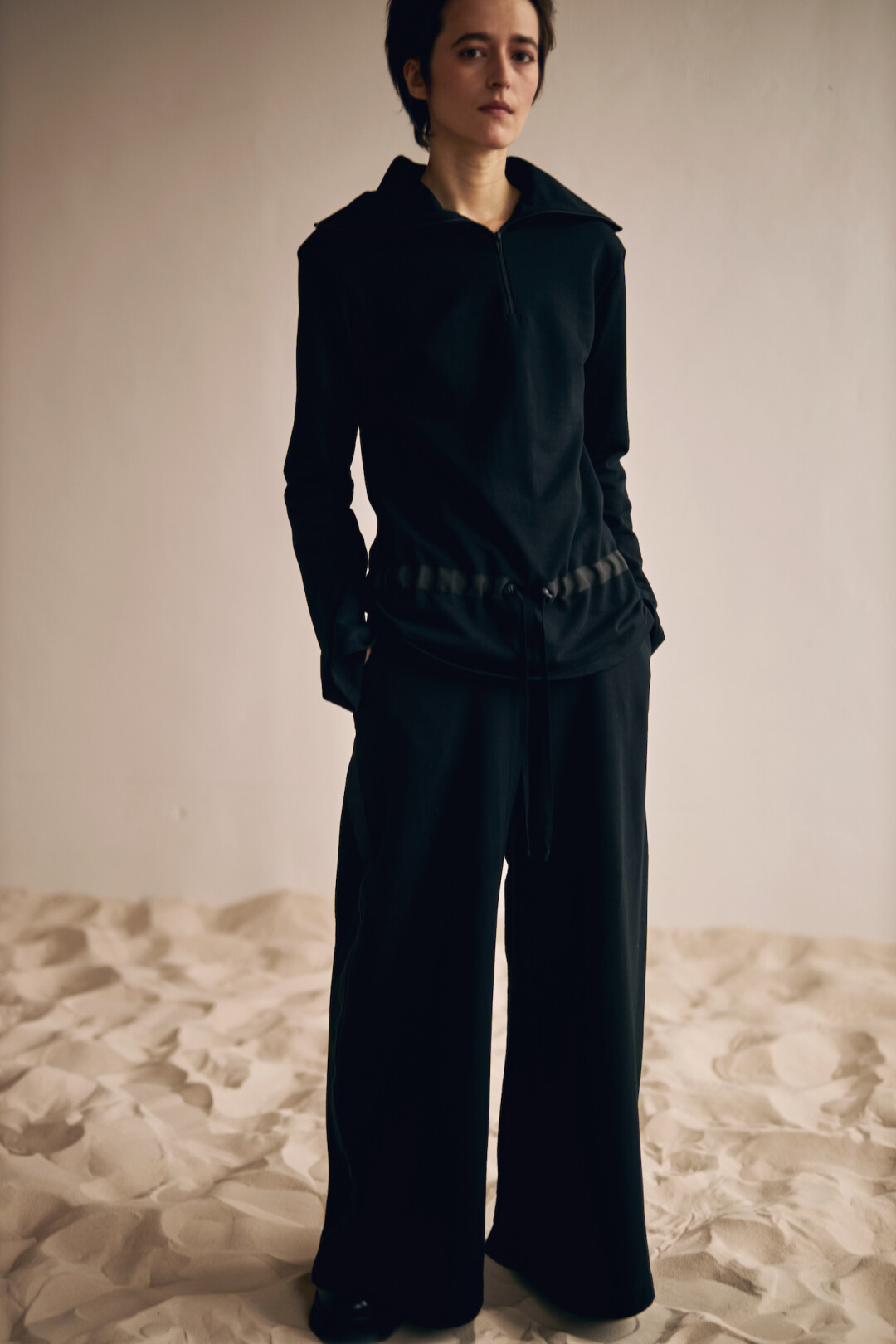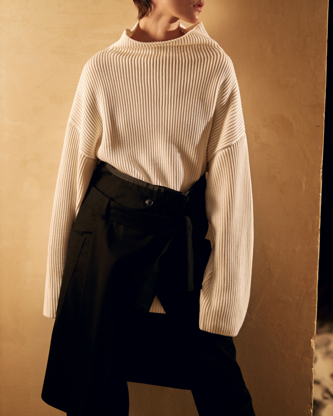 Большая часть одежды в коллекции — унисекс. Бомбер-оверсайз (воланы напоминают о том самом плаще), куртка-пиджак, лонгслив, широкие брюки-палаццо или сумка-хобо легко впишутся как в мужской, так и в женский гардероб. Но есть и чисто женские модели, в том числе юбка эффектного кроя, которую можно носить и поверх брюк.