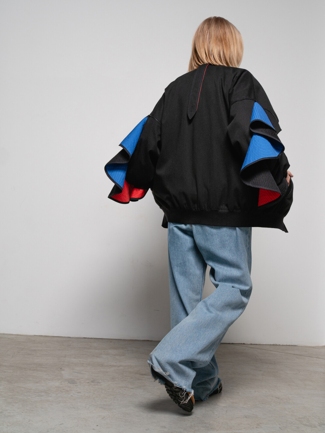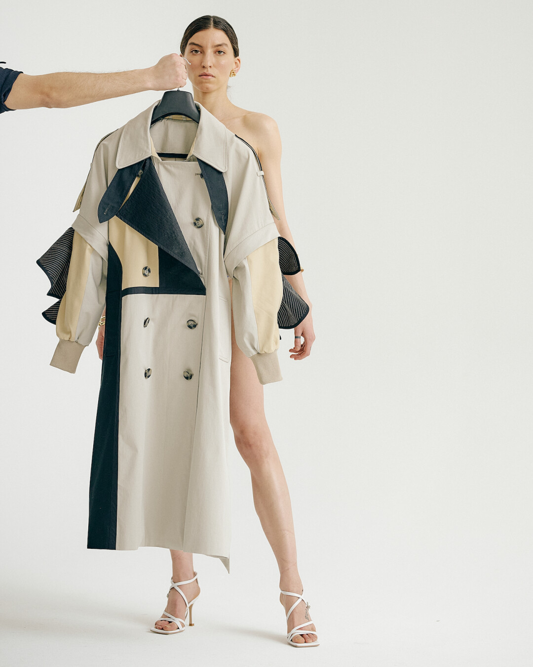 В плаще есть цветные вставки — это как раз секонд-хенд: несколько рукавов, в том числе знаковый с воланом. Все продуманно. Мы долго экспериментировали, как внедрить в новое изделие секонд: эта ткань уже б/у, она менее долговечна. Искали те детали в модели, где можно использовать секонд без ухудшения качества, функциональности и эстетики конечного изделия. Кроме того, у людей есть предубеждение против бэушных вещей. Поэтому в качестве флагмана марки мы выбрали верхнюю одежду — она не соприкасается с телом и нивелирует негативное восприятие секонда. Изначально мы предполагали максимизировать использование б/у, но в итоге отказались от этой идеи, чтобы обеспечить хорошее качество и долговечность».