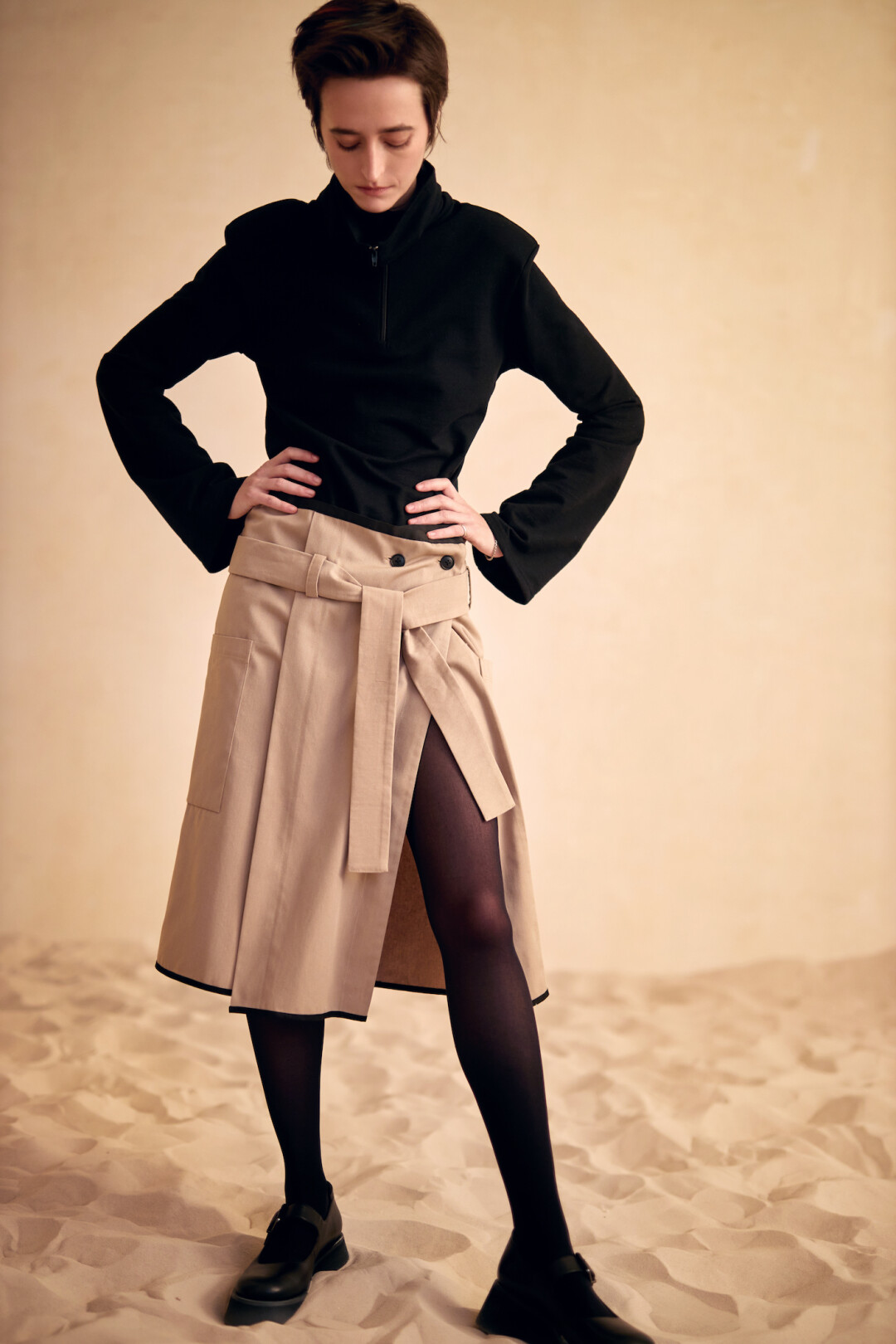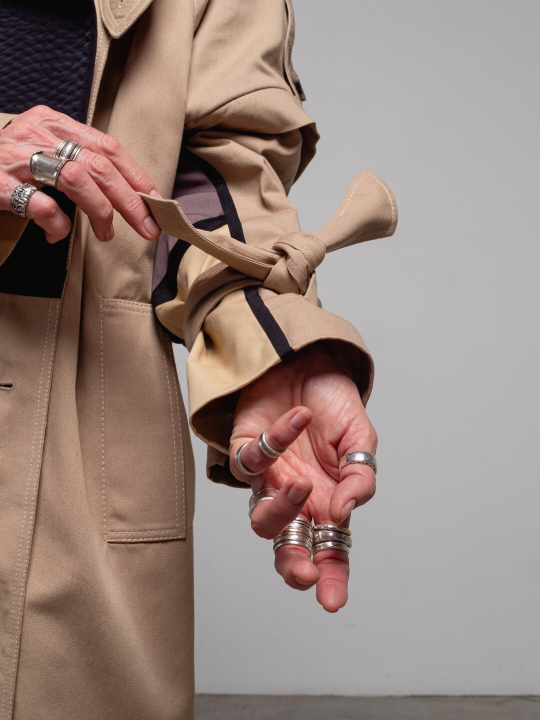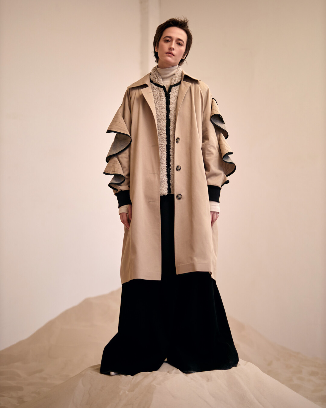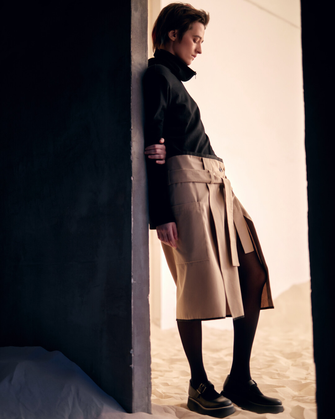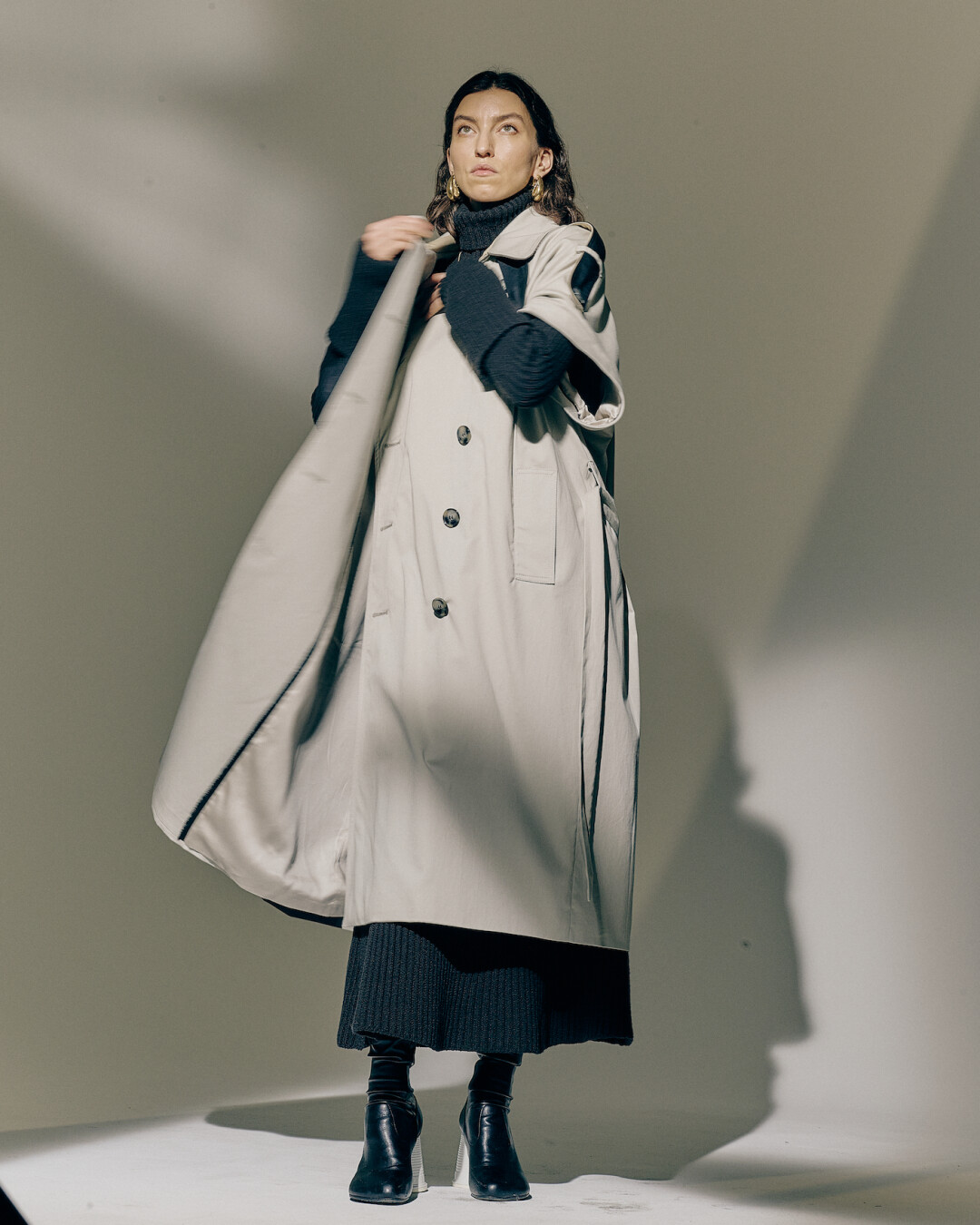 Юлия Ман: «Смысл был в том, чтобы создать вещь, которая будет жить в разных гардеробах — она функциональная, нужная, закрывает многие потребности. Прохладное лето, весна, межсезонье — плащ универсален.