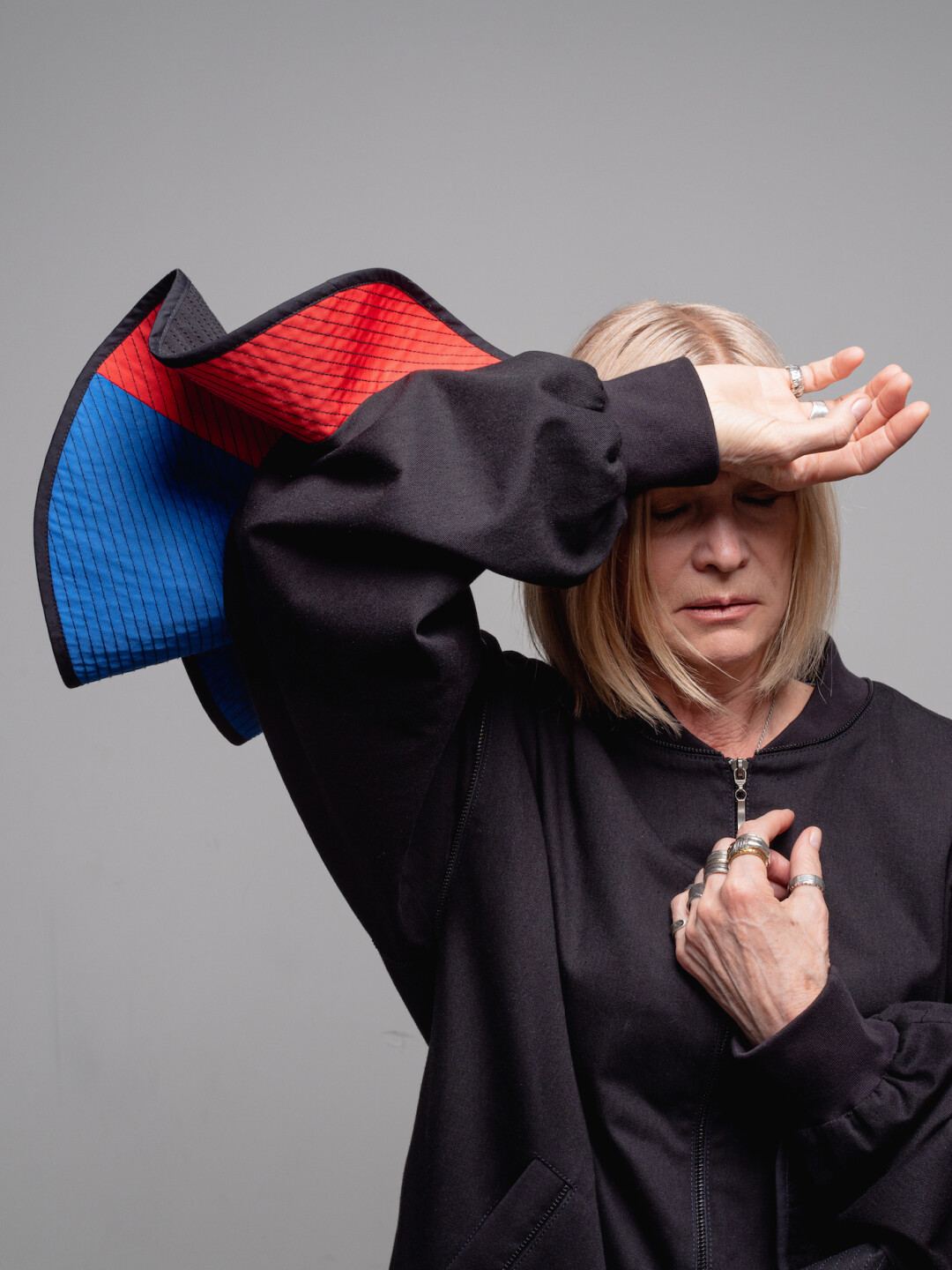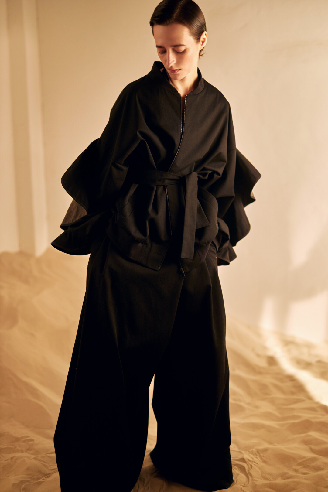 Устойчивость и экологичность предполагает и работу с правильными материалами, и дизайн, который позволяет вещи быть практичной и служить долго, и возможности правильной утилизации. Это цикличный процесс. И многое зависит от продуманного старта. На уровне идеи ты должен заложить все возможные будущие этапы существования изделия: от покупки до утилизации. Не просчитать, как вещь дальше будет жить, — это уже какая-то полуустойчивость. Мы много об этом размышляли, конструируя наш плащ.