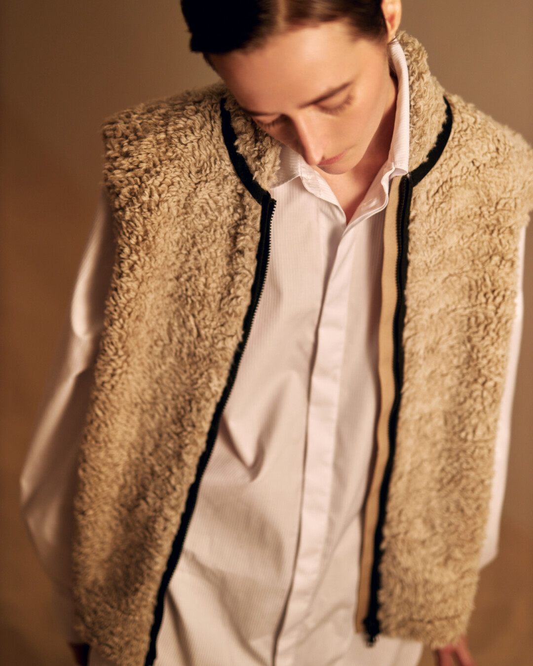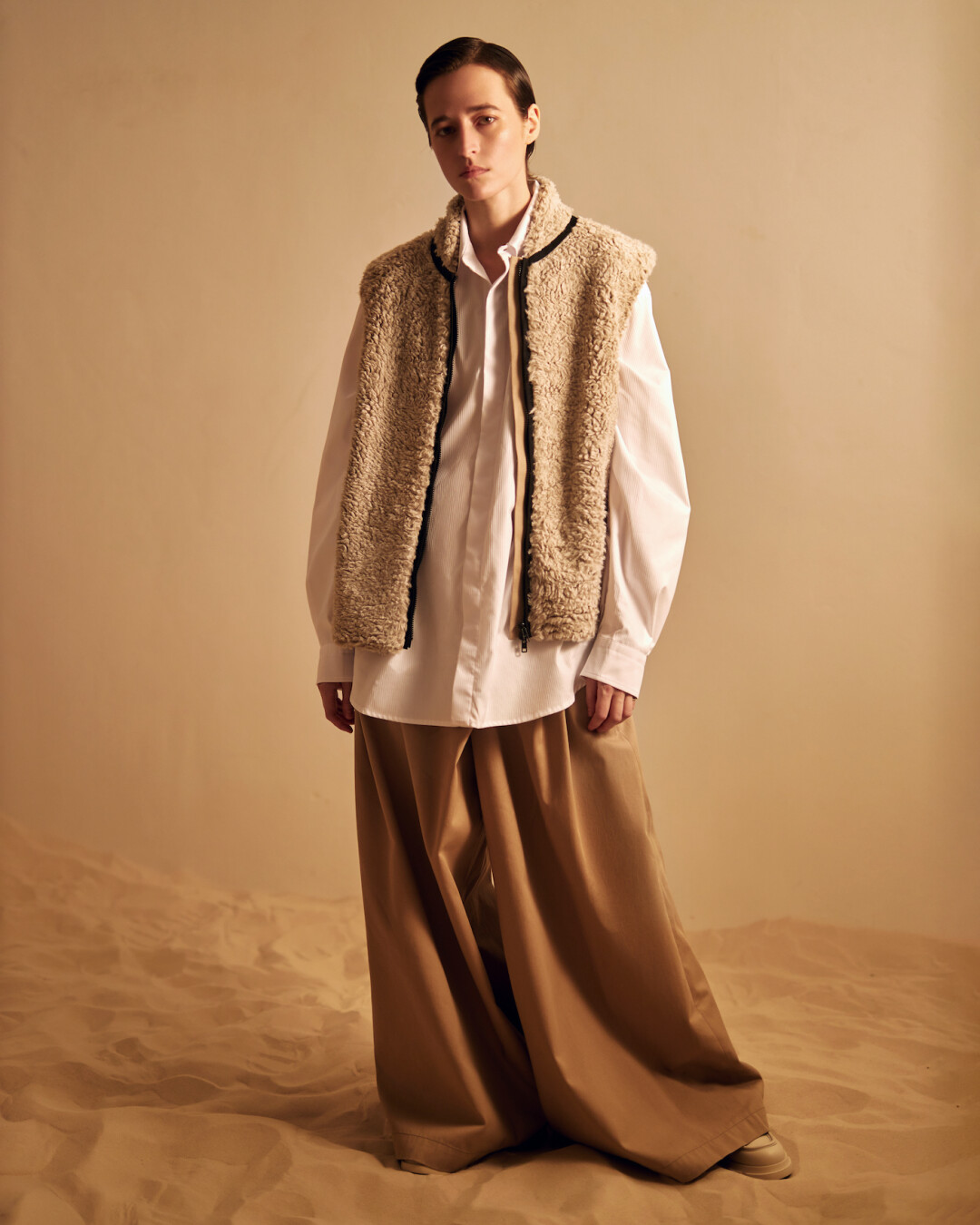 Эта одежда многофункциональна и легко участвует в многослойных образах. Например, жилет из конопляного меха не только отлично поддевается под пальто, но и носится поверх одежды (расширенная пройма и объем продуманы с таким учетом специально).