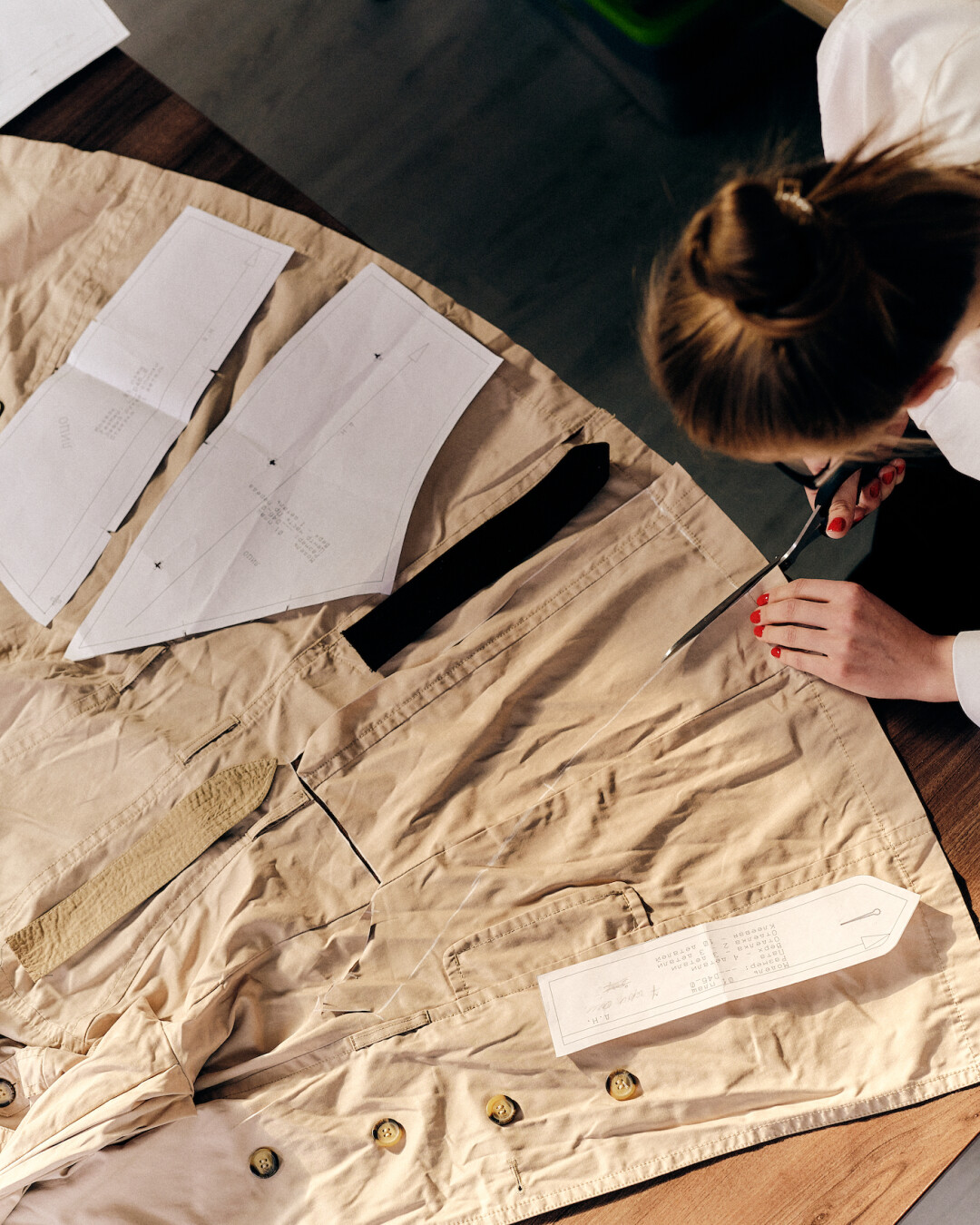 Плюс отталкивались от материала. Его плотность, его функция, возможность сделать так, чтобы одежда служила долго. Надо было выбрать поставщика. Сегодня с этим проще, но в 20-м мы нашли единственного, имевшего действительно все сертификаты экологичности и устойчивости. Основной материал, из которого сшит плащ, — вторичная ткань, переработанные отходы швейных производств. Фабрики разволокняют остатки и создают из них новые повторные волокна, из которых потом делают ткань.