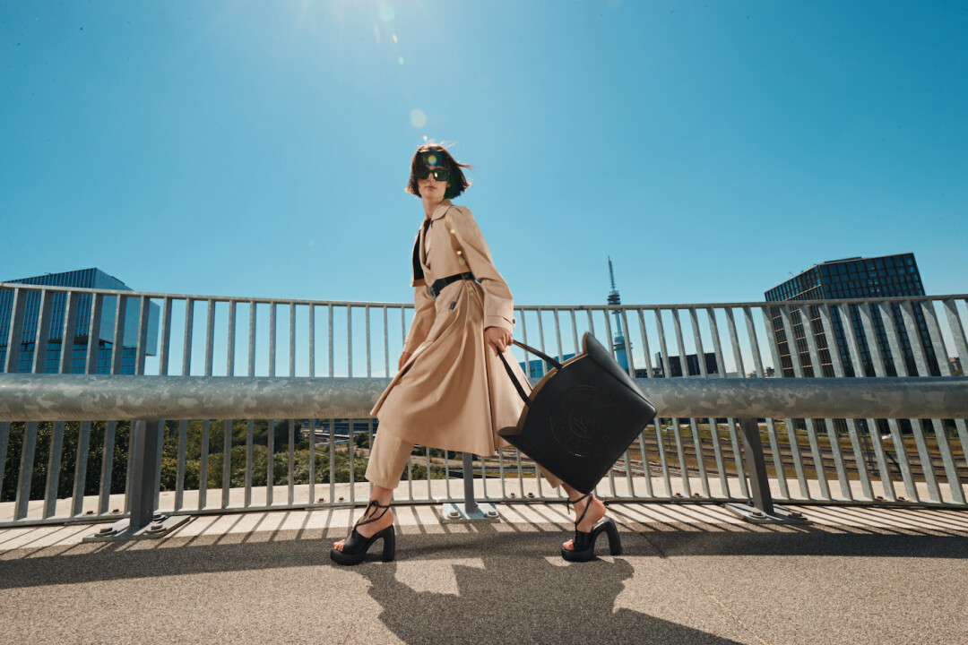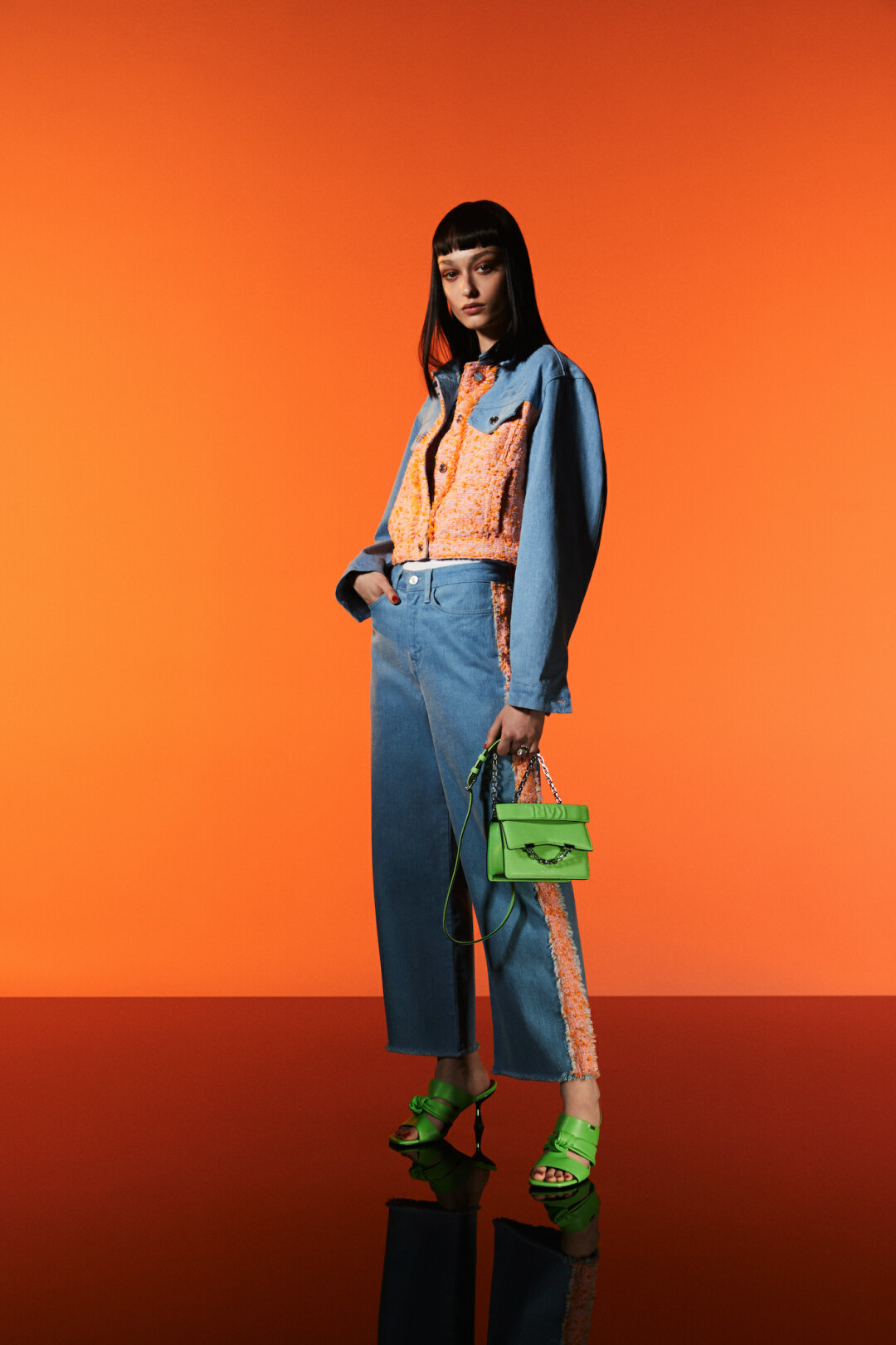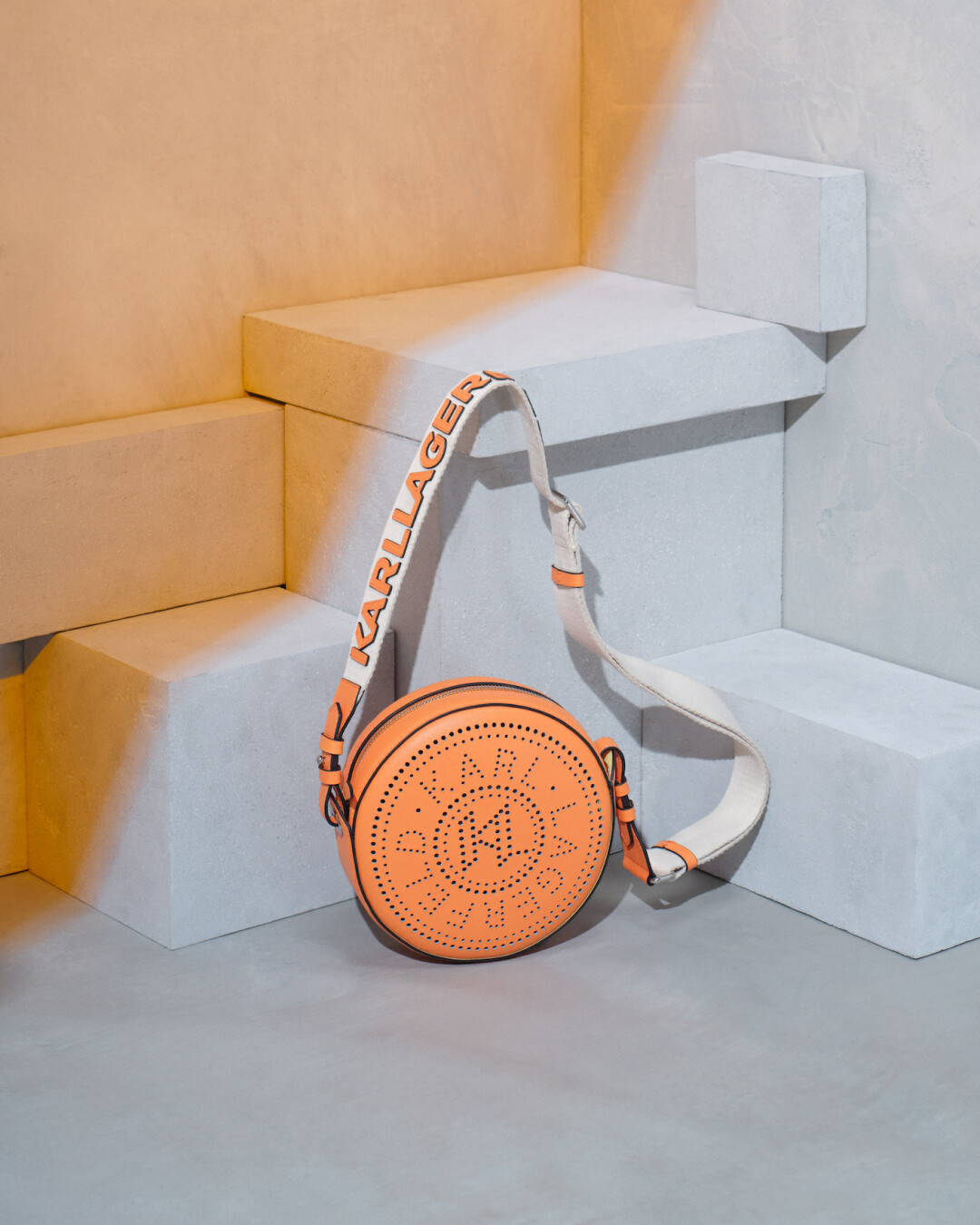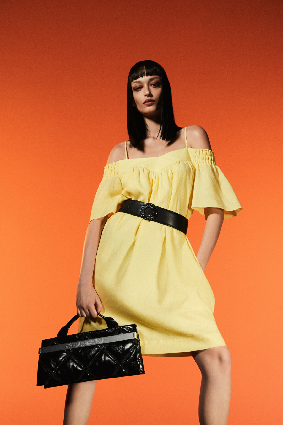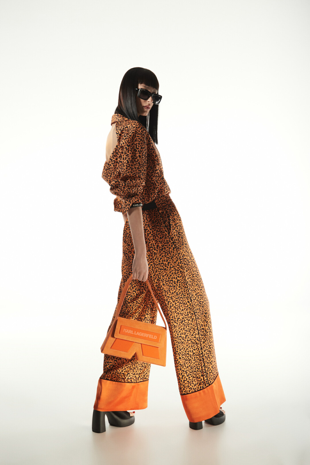 В той же палитре выдержана и широкая линейка аксессуаров, так чтобы с ними можно было составлять монохромные образы или же использовать в качестве главного акцента. Пример подают в лукбуке: тот самый леопардовый пижамный костюм дополнен оранжевой сумкой Essential K в форме первой буквы имени Карла Лагерфельда, брендированные джинсы перекликаются с багетом K/Seven, сшитым из того же материала, а архивная модель K/Kross сливается с приталенным пальто лимонного цвета, но не теряется на его фоне — благодаря металлическим деталям и подчеркнутой архитектурной форме.